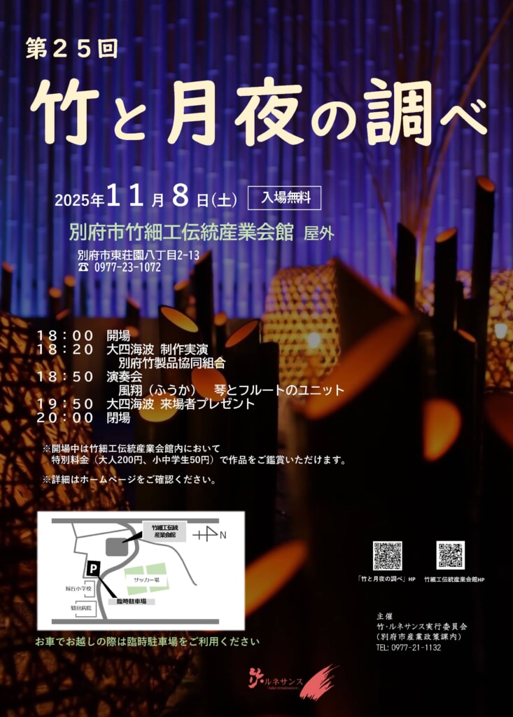 【その他】 当日18時から、特別入館料金で別府市竹細工伝統産業会館に入館いただけます。 特別入館料金 高校生以上 200円(税込)(通常390円) 小・中学生 50円(税込)(通常130円)