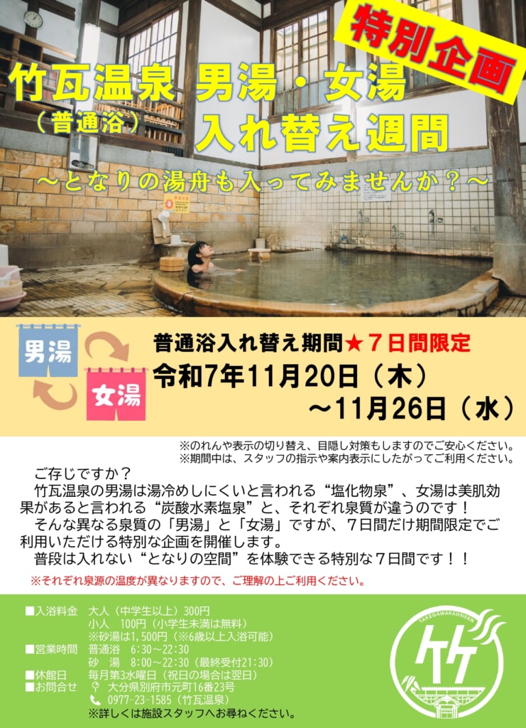 竹瓦温泉 男湯・女湯 入れ替え週間〜となりの湯船も入ってみませんか?〜