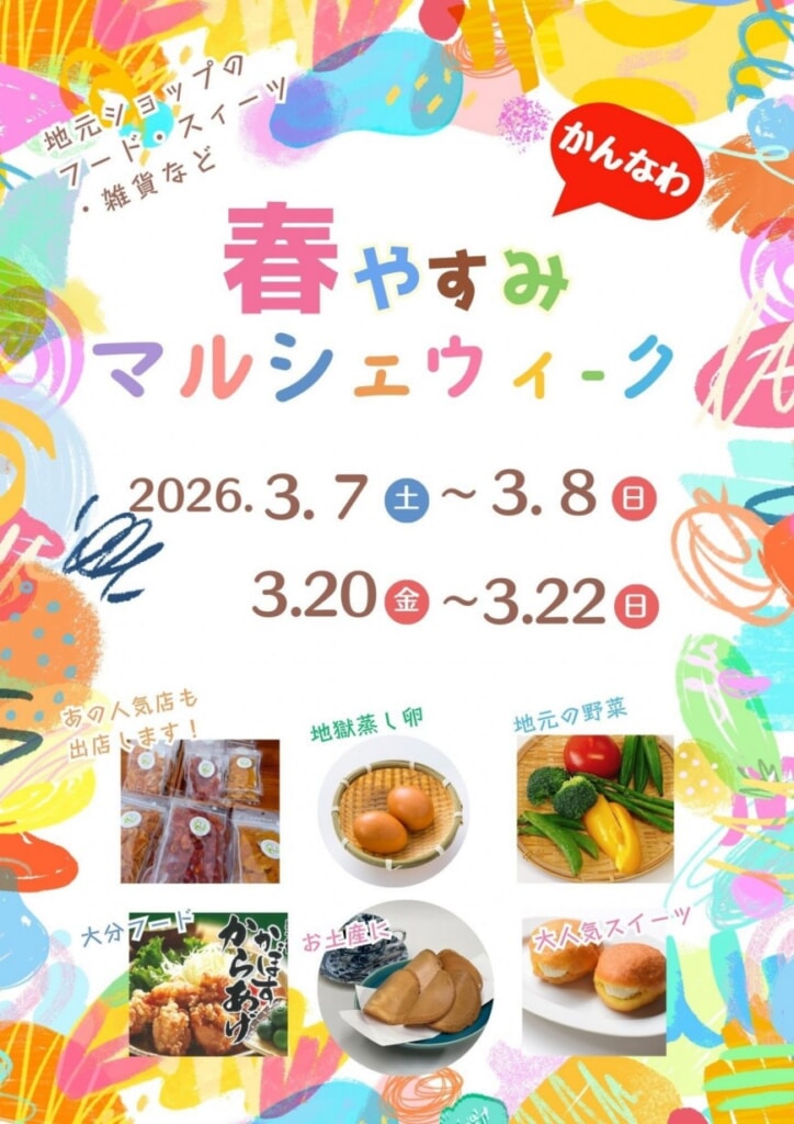 地獄蒸し工房鉄輪の入口広場では「かんなわマルシェ」が随時開催されています。3月は7日(土)~8日(日)、20日(金)~22日(日)で開催の予定です。ご来館をお待ちしています。