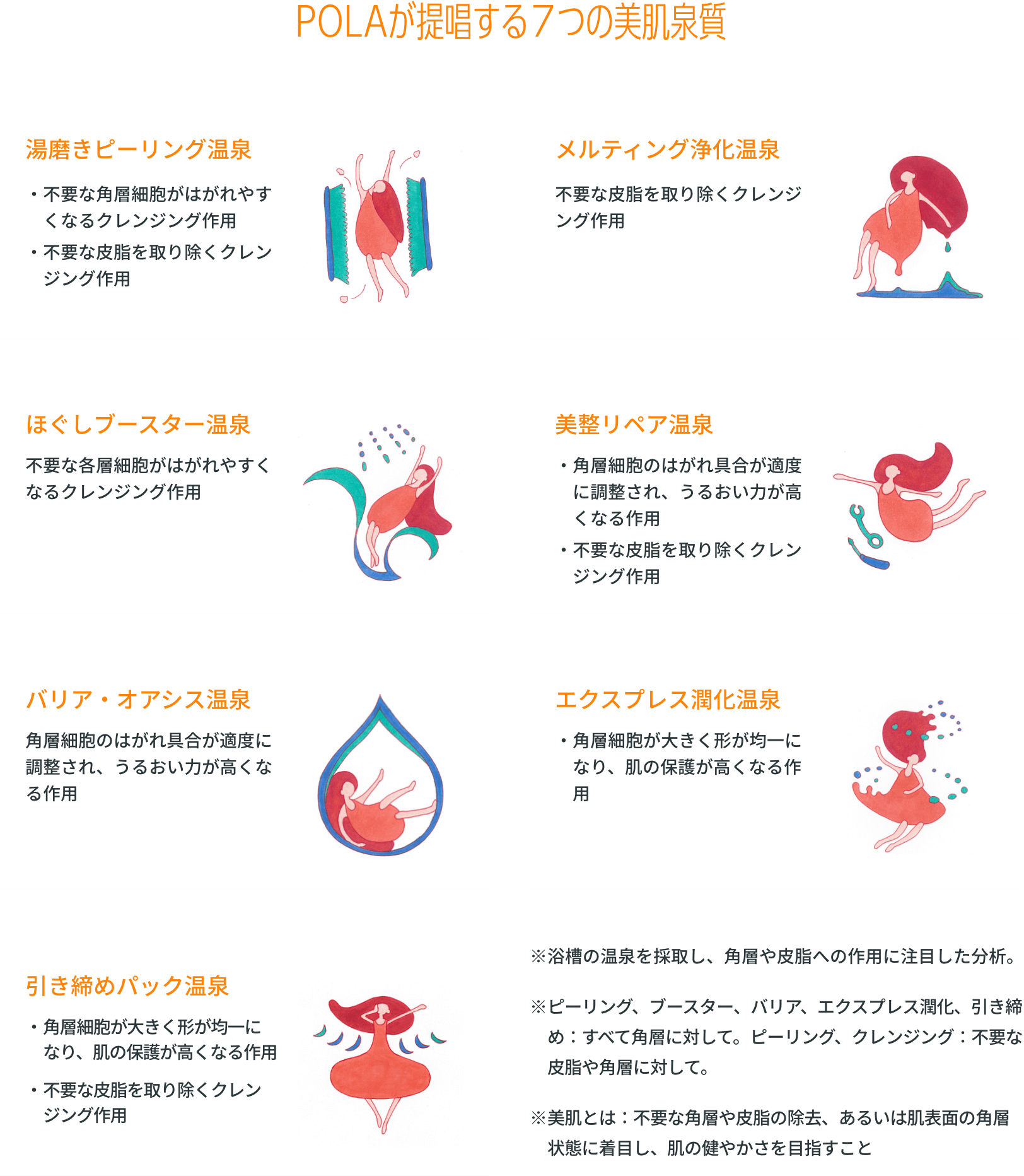 独自の肌分析技術を使った「美肌温泉研究」で日本各地の温泉を分析した結果、これまでに7種類の美肌泉質が見つかったそう。