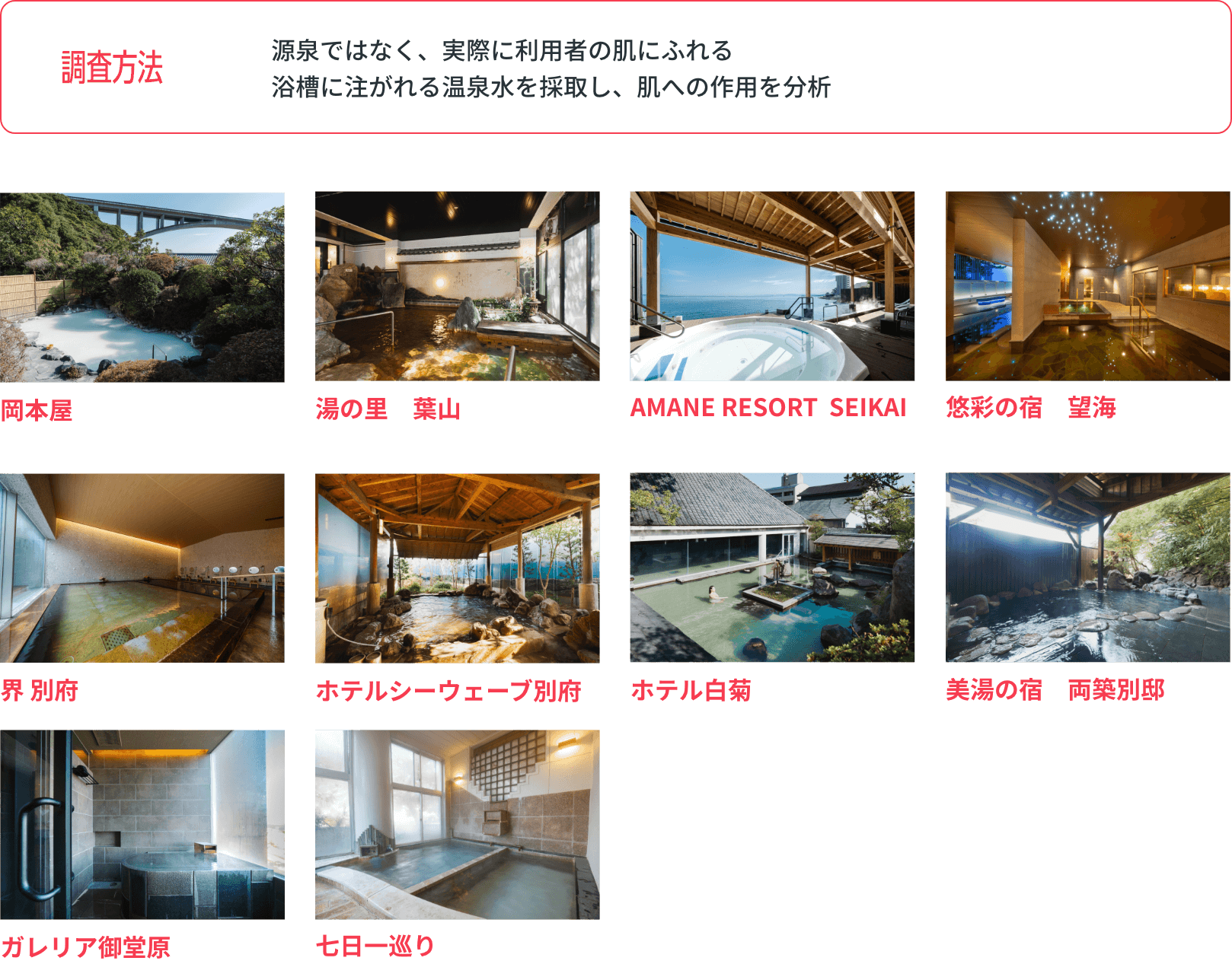 今回は、別府市にある温泉宿のなかから、以下の10のお宿で美肌作用の分析を実施しました。実際に利用者の肌にふれる浴槽に注がれる温泉水を採取し、肌への作用を分析しました。