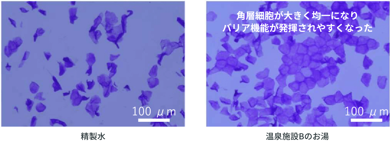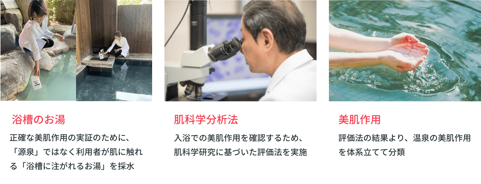 長年、女性の肌と向き合い肌研究を行っている株式会社ポーラは、温泉に入ると「肌がうるおう・なめらかになる」といった声を実際 に検証。浴槽に注がれる温泉を採水し、人の肌などで美肌作用を評価するという研究を行なっています。