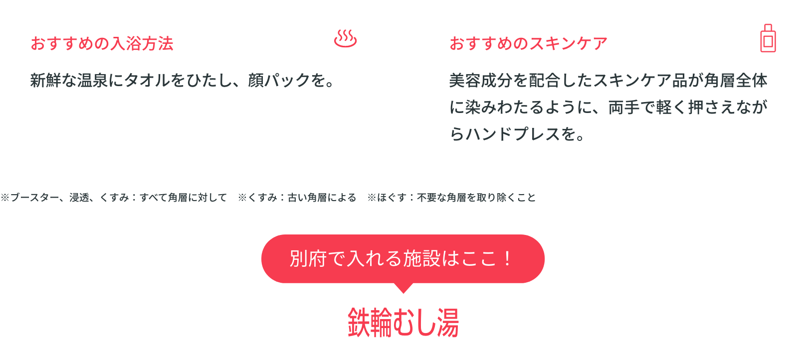| ・鉄輪むし湯(2024) | 不要な角層細胞がはがれやすくなるクレンジング作用 | ー |