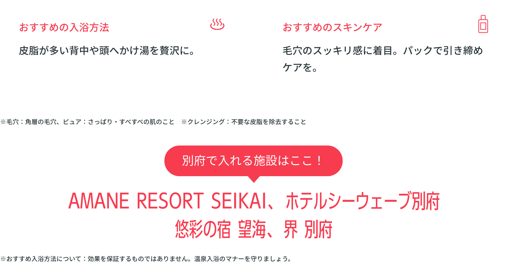 これらの研究を元に、美肌作用を7つの美肌泉質に分け、温泉とスキンケアによる「美肌磨き」体験を提案しています。