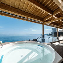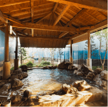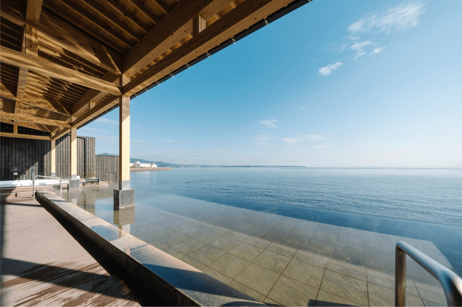 泉質は単純泉で、湯の花が浮かんでいるのが源泉かけ流しの証。内湯、露天風呂、家族風呂をはじめ、男性限定のサウナや、女性限定の岩盤浴も完備しています。温泉で癒された後は、湯上がり処で地酒を味わいながらプレミアムなひとときを。温泉は立ち寄り入浴も可能で、ホテルの入口には絶景を望む足湯も完備されています。