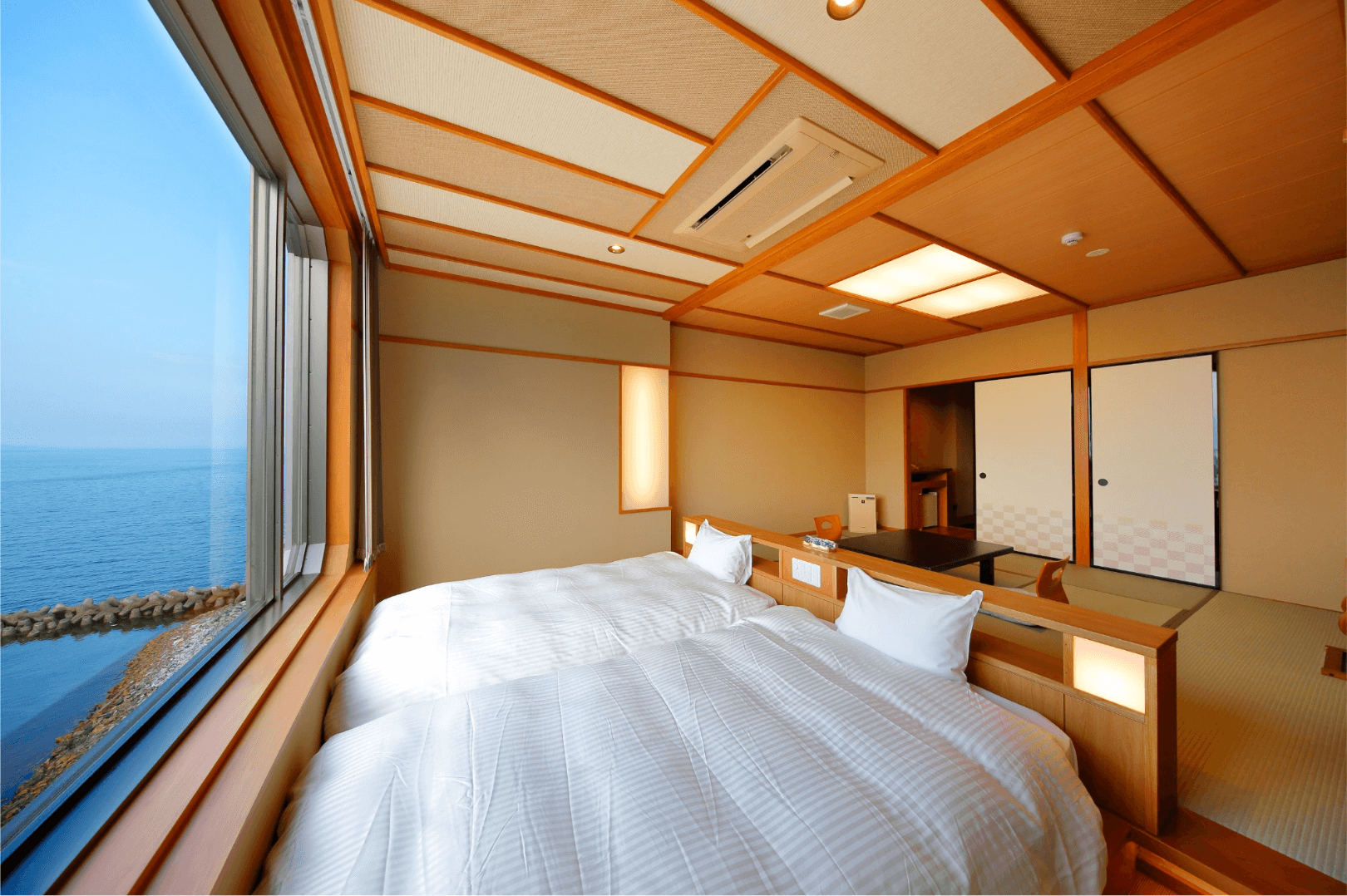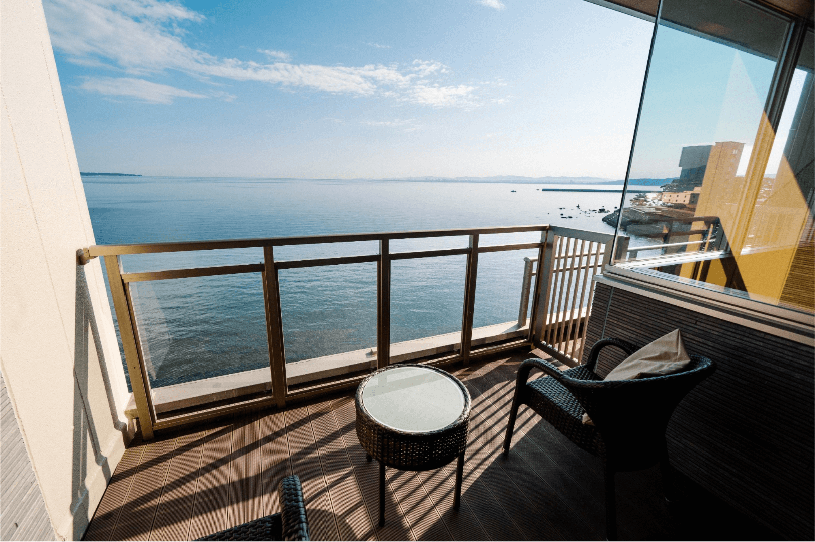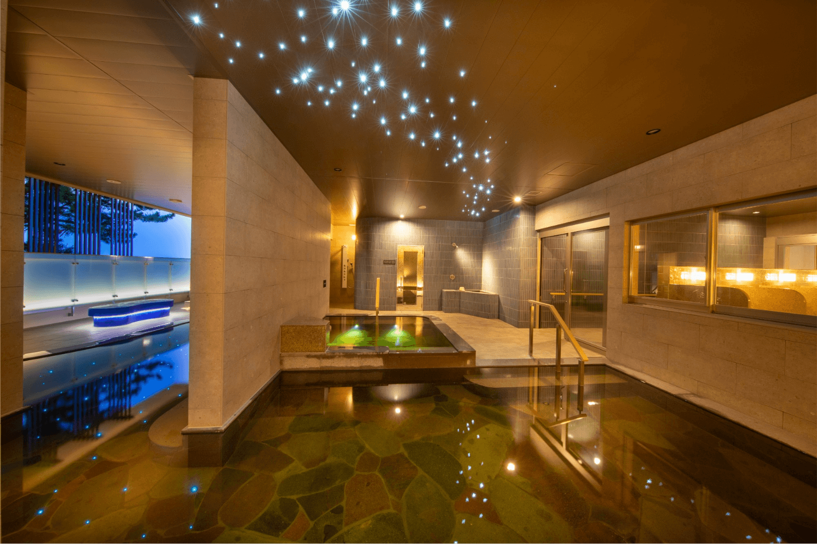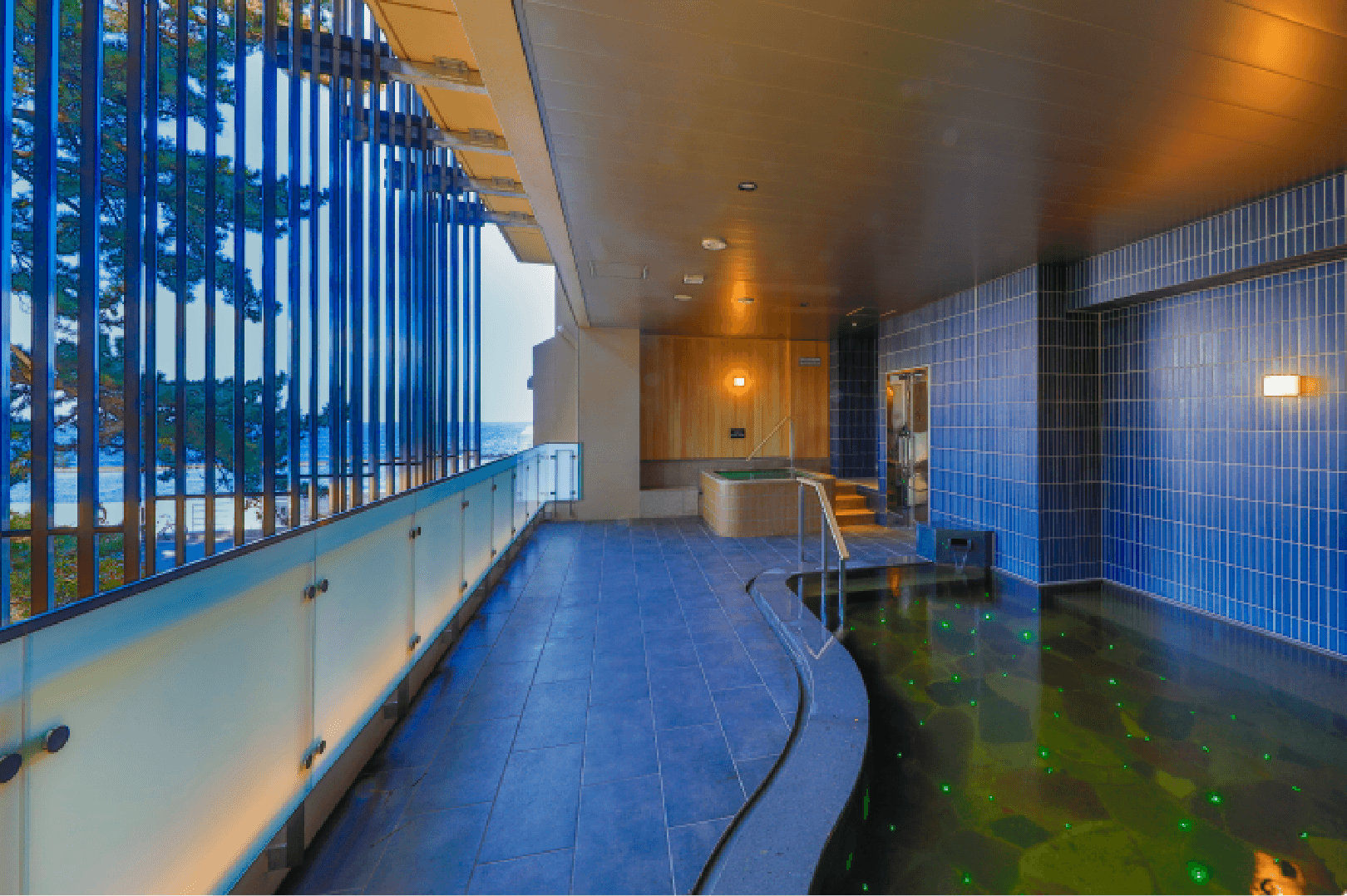 また、海抜0mに位置する大浴場「潮騒の湯」も、もちろん源泉かけ流し。湯船に浸かるとまるで海と一体になるような絶景が広がり、潮風が心地よく頬をなでます。大浴場は、時間限定で立ち寄り湯も可能です。