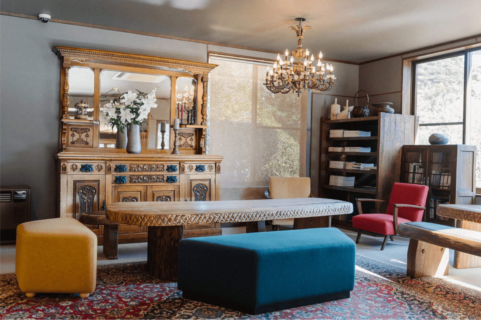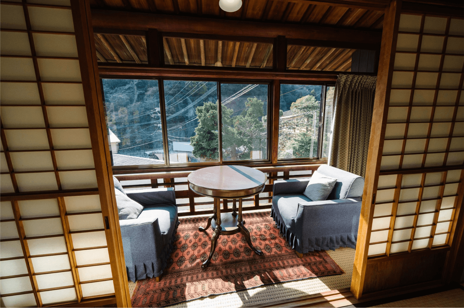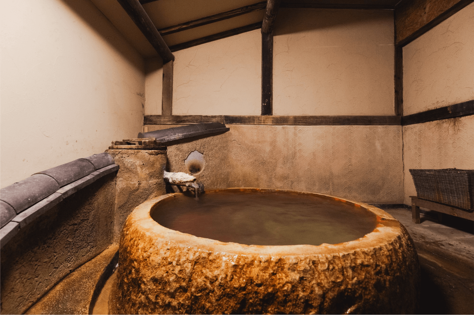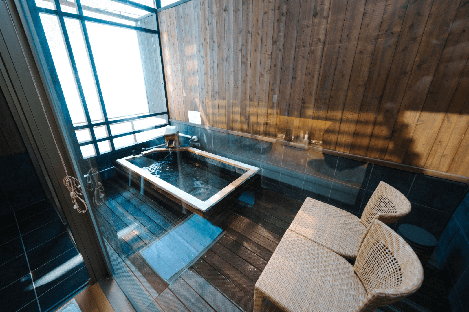 そんな湯治場文化が根強いエリアにあるアートを感じられる宿。客室には全て半露天風呂が備わっていて、まちを一望する眺望とともに硫黄泉を心ゆくまで堪能できます。無垢の大きな石で作った特注の浴槽を使用し、タイルには美濃焼を採用。素材の質感と温泉の相性が良く、遠赤外線効果で身体を芯から温めてくれます。