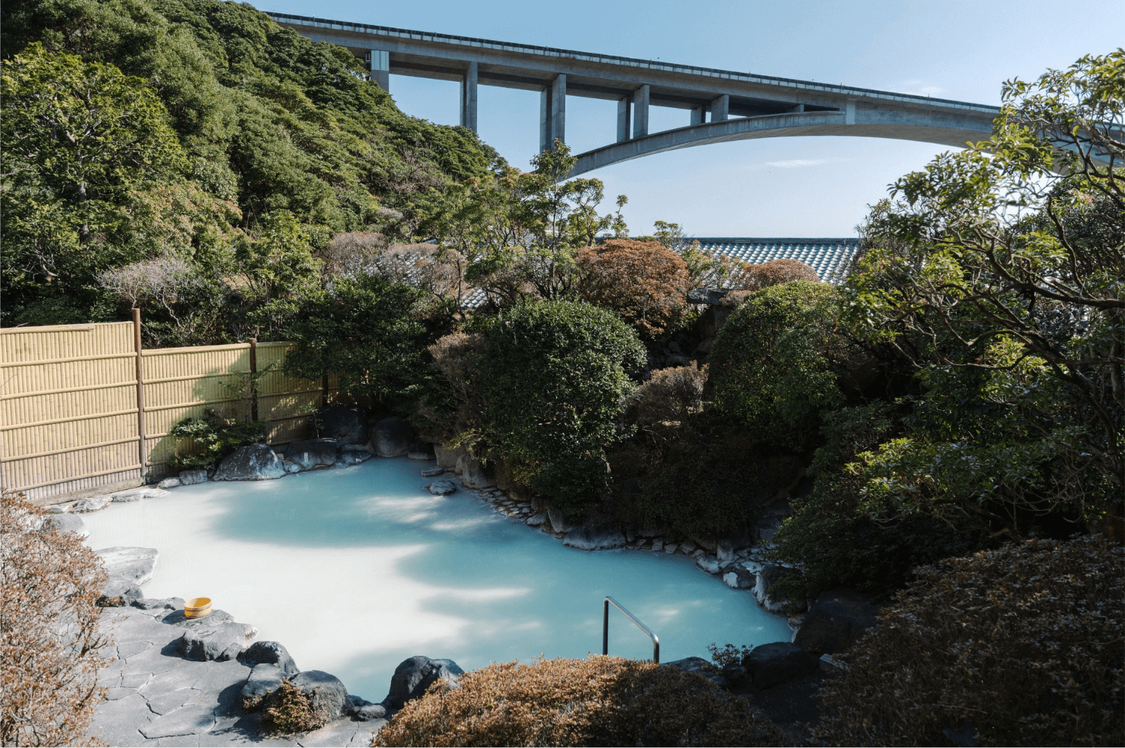 自慢は、宿の山手で自噴する新鮮な温泉を直接引き、加水・加温なしの新鮮な温泉です。神秘的なミルキーブルーのお湯には硫黄泉が多く含まれていて、これは別府八湯の中でも薬効が高いとされている硫黄泉。露天風呂や内湯(岩風呂と檜風呂)で堪能できるほか、内湯付きの客室も完備しています。