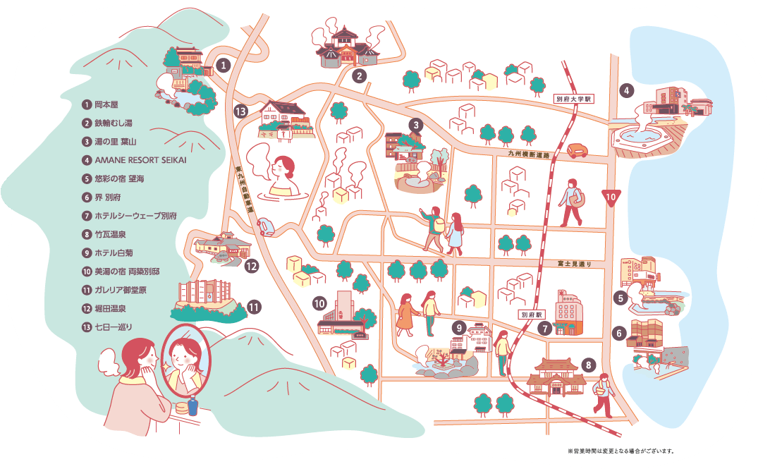 | ・AMANE RESORT SEIKAI ・界 別府 ・ホテルシーウェーブ別府 ・悠彩の宿 望海 |