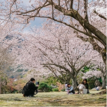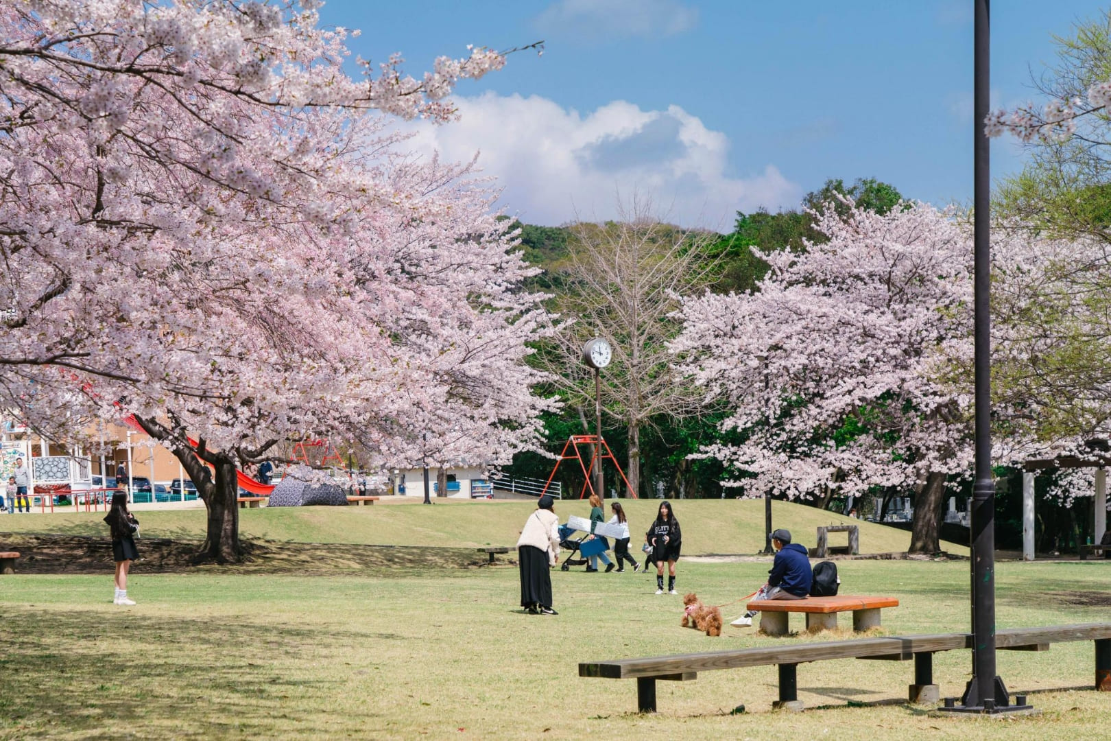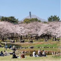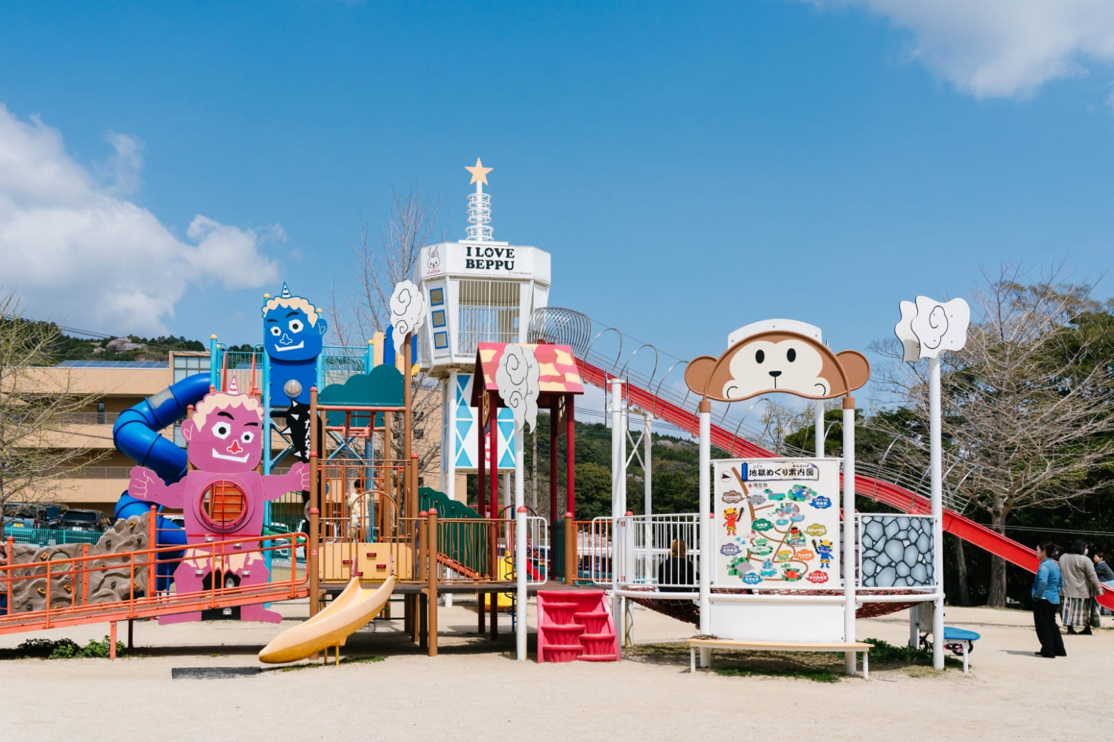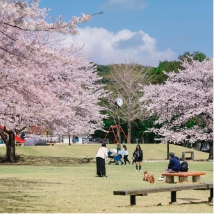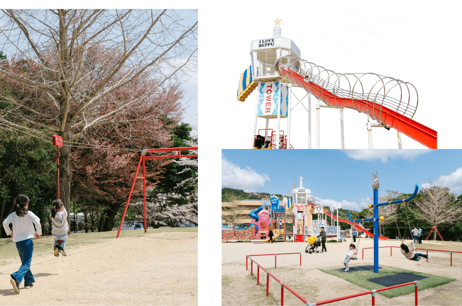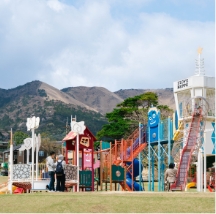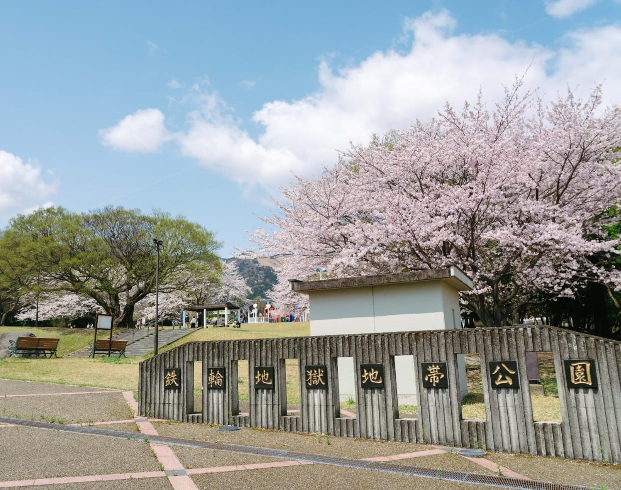 観光名所の「地獄」が近くに点在し、子連れに大人気の公園です。別府の地獄などをモチーフにした大きなアスレチック遊具は、いつも子どもたちで大賑わい。長い滑り台、ミニボルダリング、ブランコや滑車のついたターザンロープなど、めいっぱい体を使って楽しめます。自然林を活かして作られた公園内には、たくさんの桜の樹があり、シーズン中は淡いピンクに包まれます。ドッグランやグランピング施設もあり、多様な楽しみ方ができる場所です。