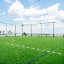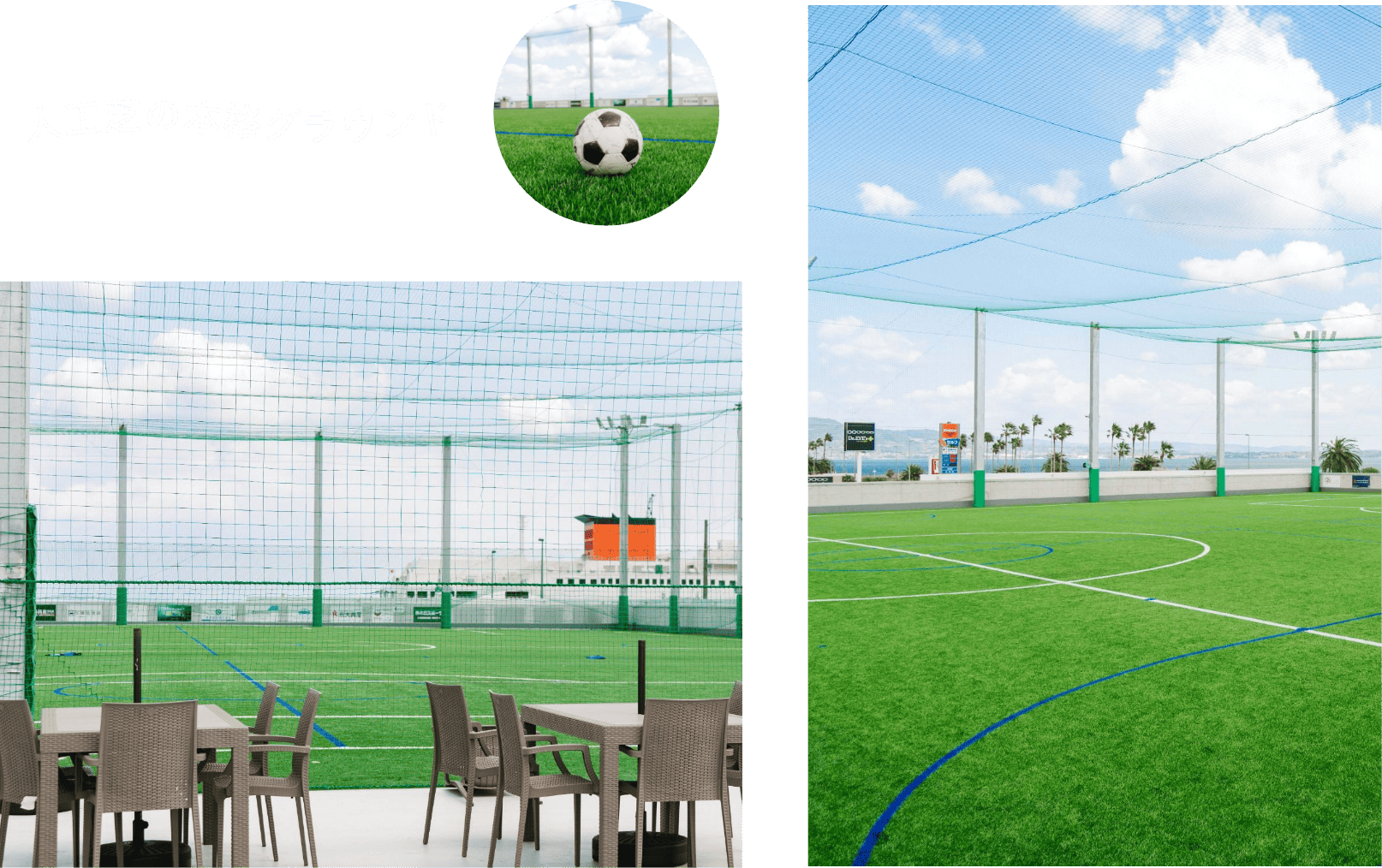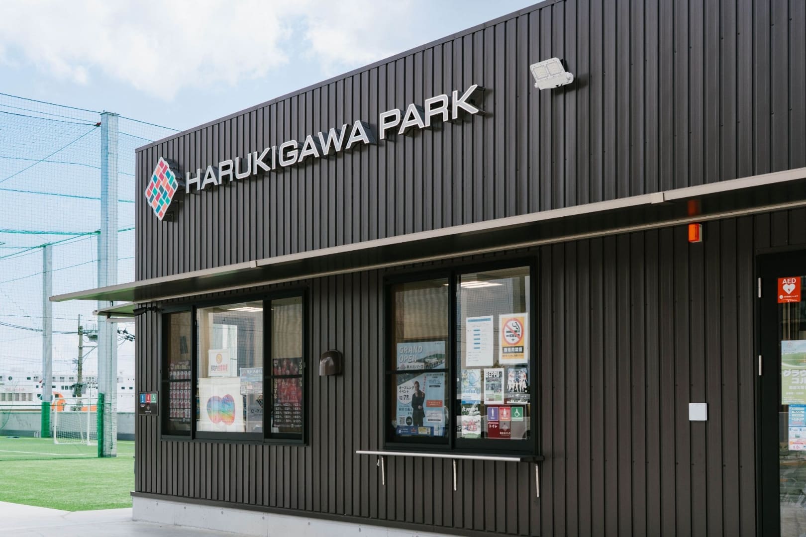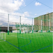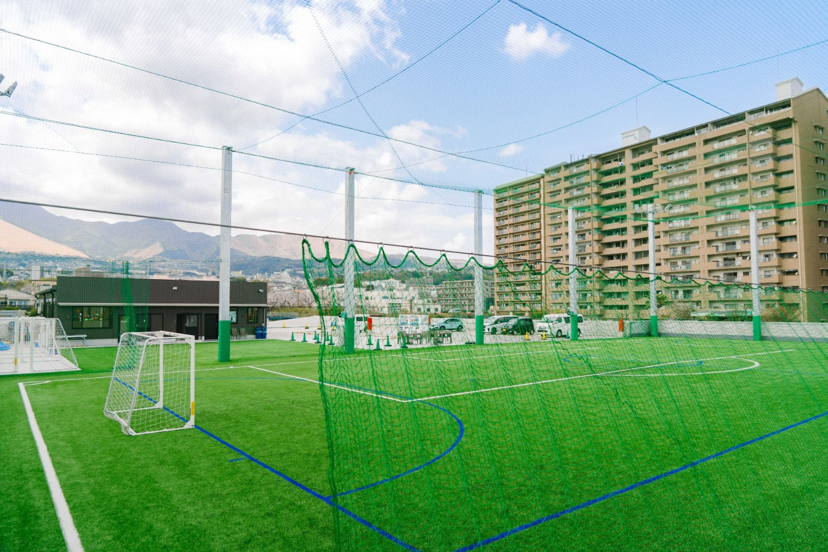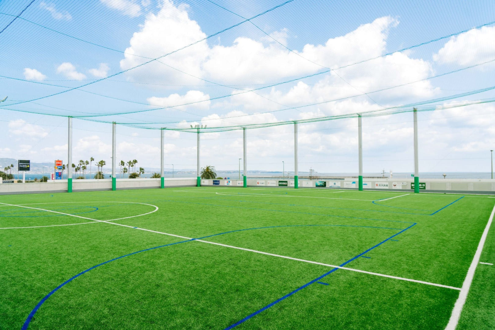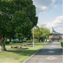 国道10号線を挟んで東エリア(海側)と西エリア(山側)分かれる公園です。西エリアの建物2階部分は、サッカー・フットサルコートやクラブハウス、1階部は大型ディスカウントストアがあります。人工芝が敷き詰められたサッカー・フットサルコートは、海風が吹き抜ける心地よいグラウンド。Webサイトで予約の上ご利用ください。ヨガやダンスなど多目的に使えるスタジオも設置されており、男女別の更衣室やシャワールームも完備しています。