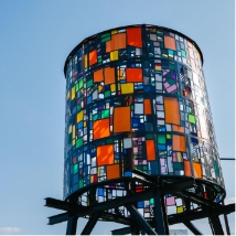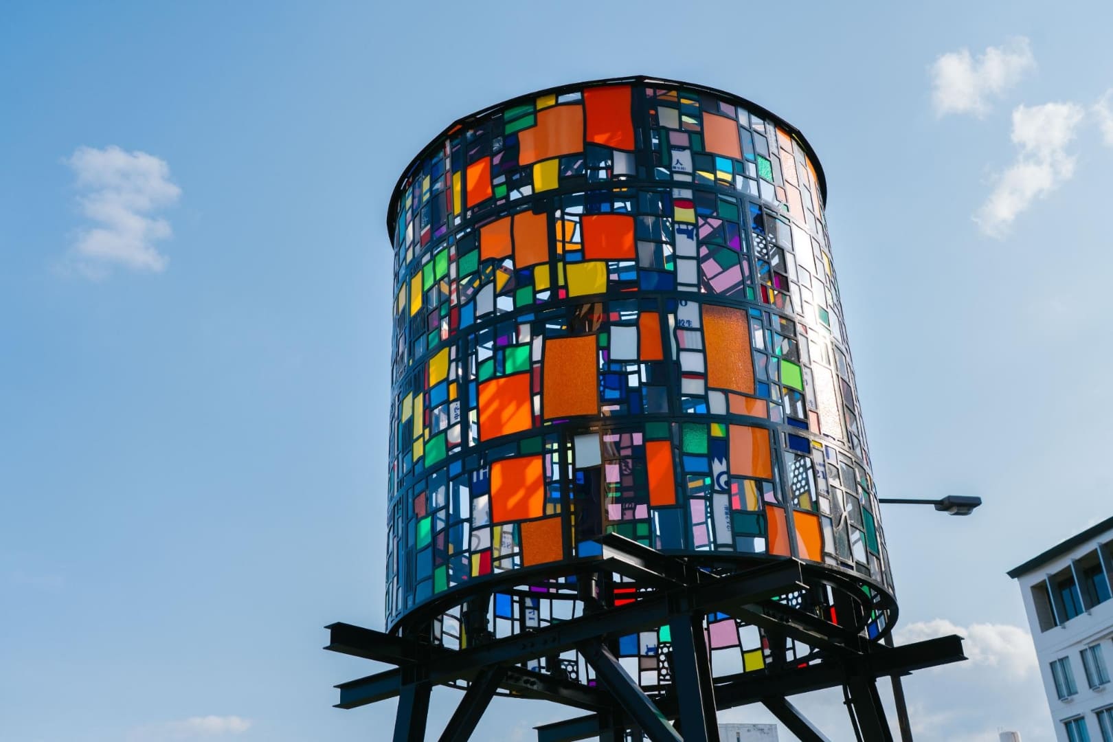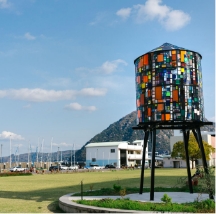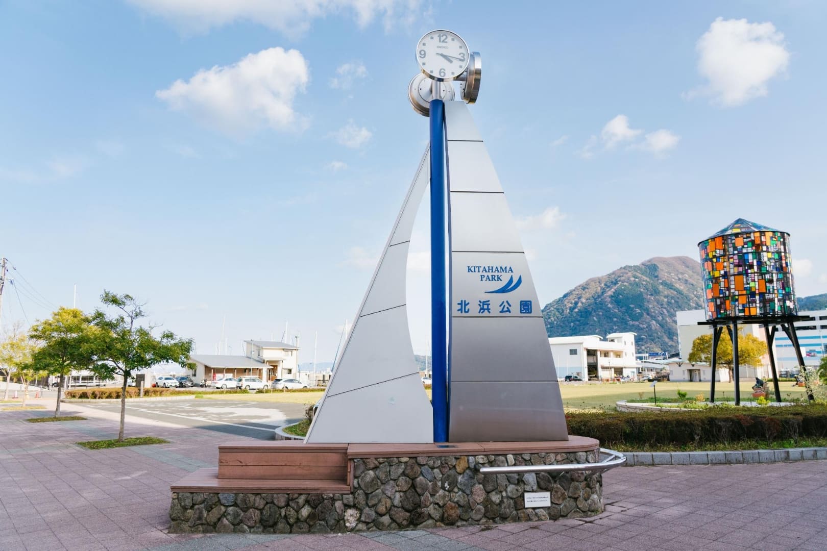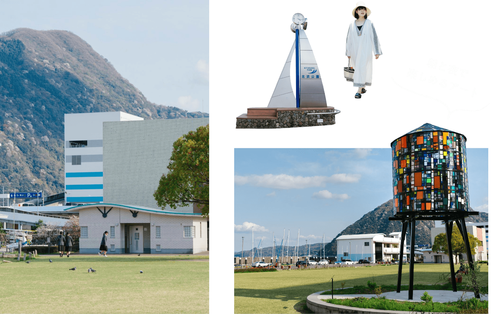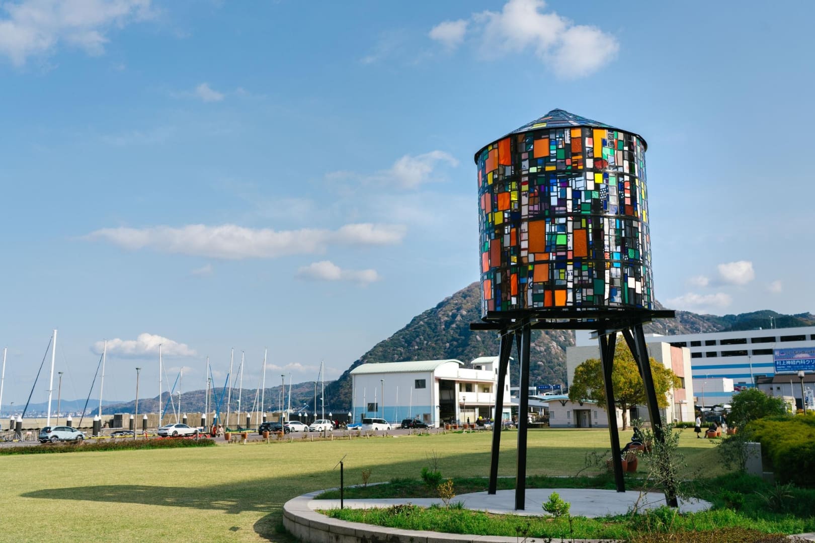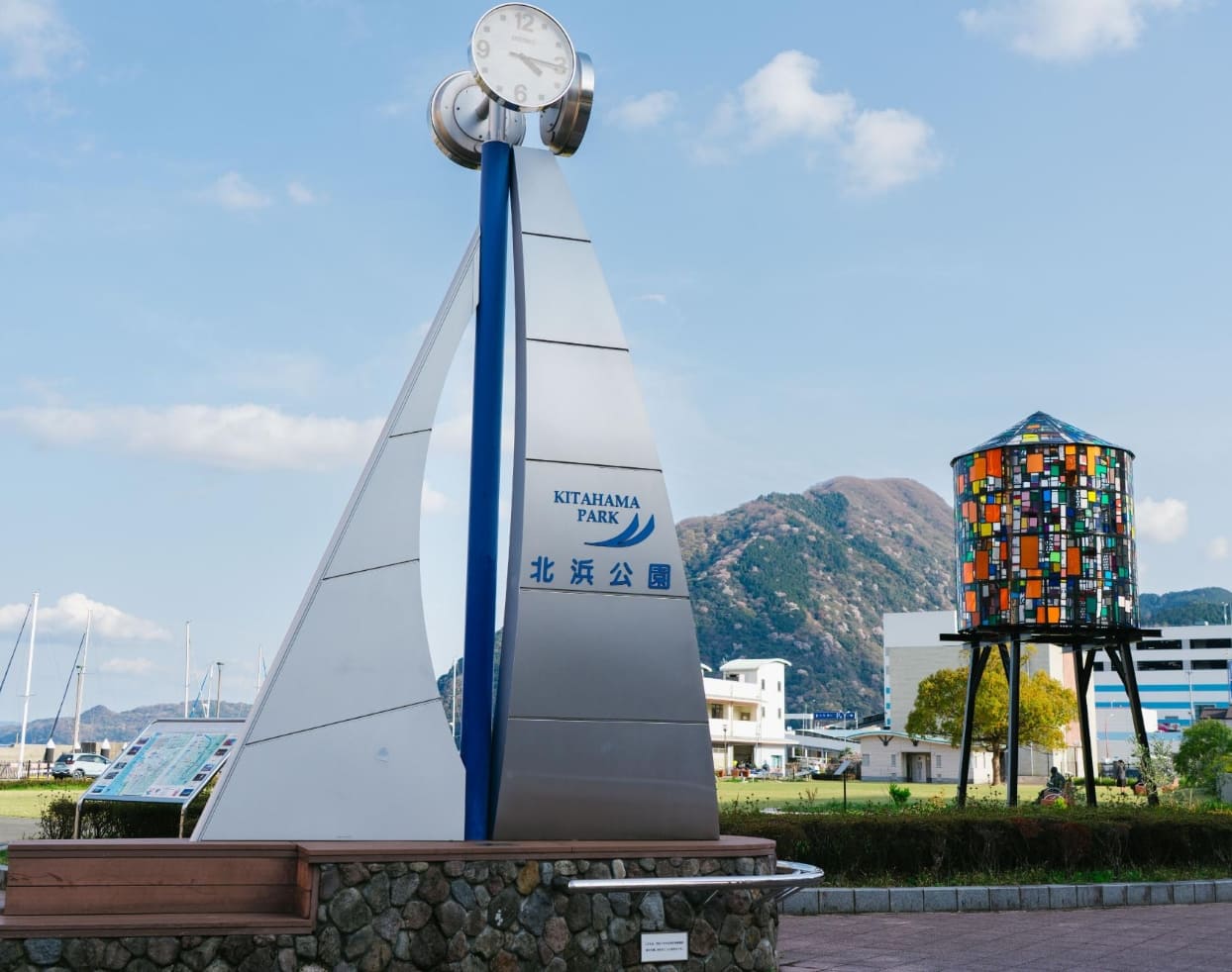 国道10号線沿い「ゆめタウン」の側、ヨットハーバーが目の前にある憩いの公園です。芝生とウッドデッキ、ベンチがあるこぢんまりとした場所。宿泊施設や飲食店街からも近く、飲み終わった後のお散歩や酔い覚ましにもおすすめです。園内には大分県内で集められたアクリルが再利用されている、トム・フルーイン作『Watertower 10: Beppu City, 2023』があります。昼は太陽の光でキラキラと、夜は明かりが灯り格別の美しさで輝く作品です。