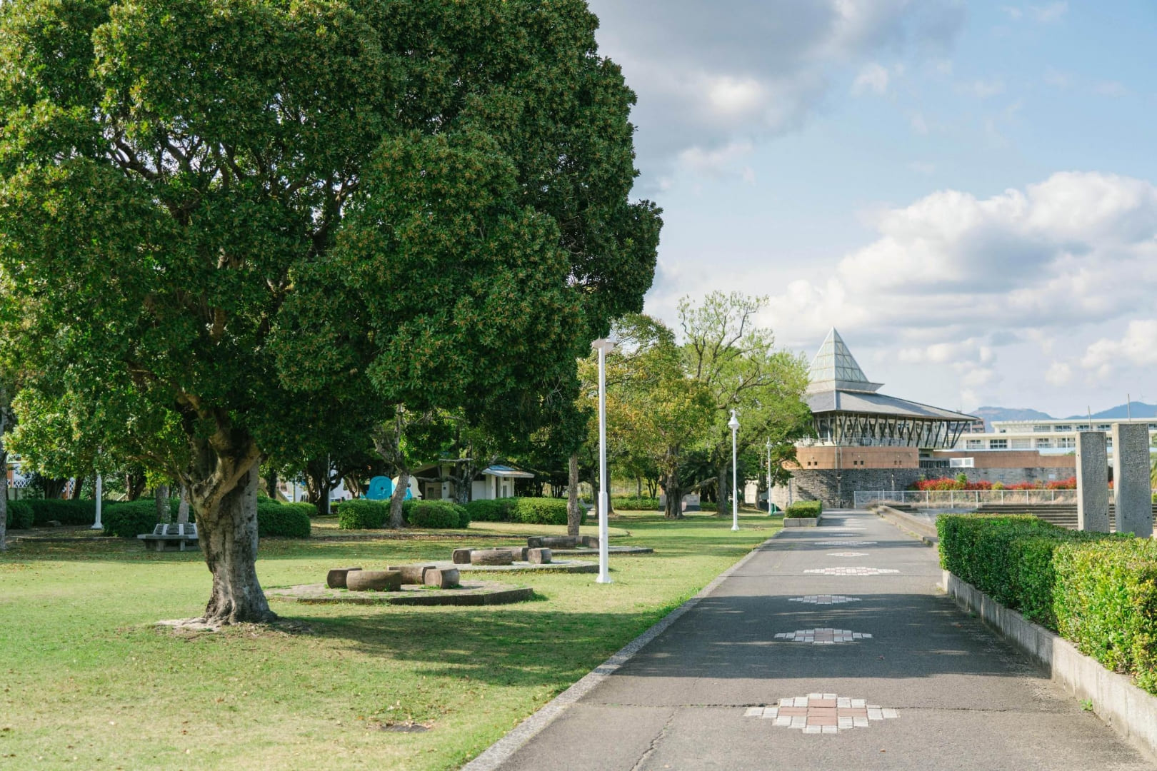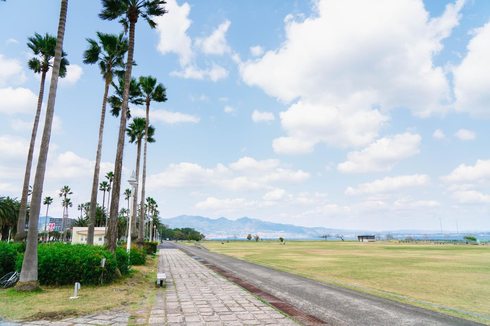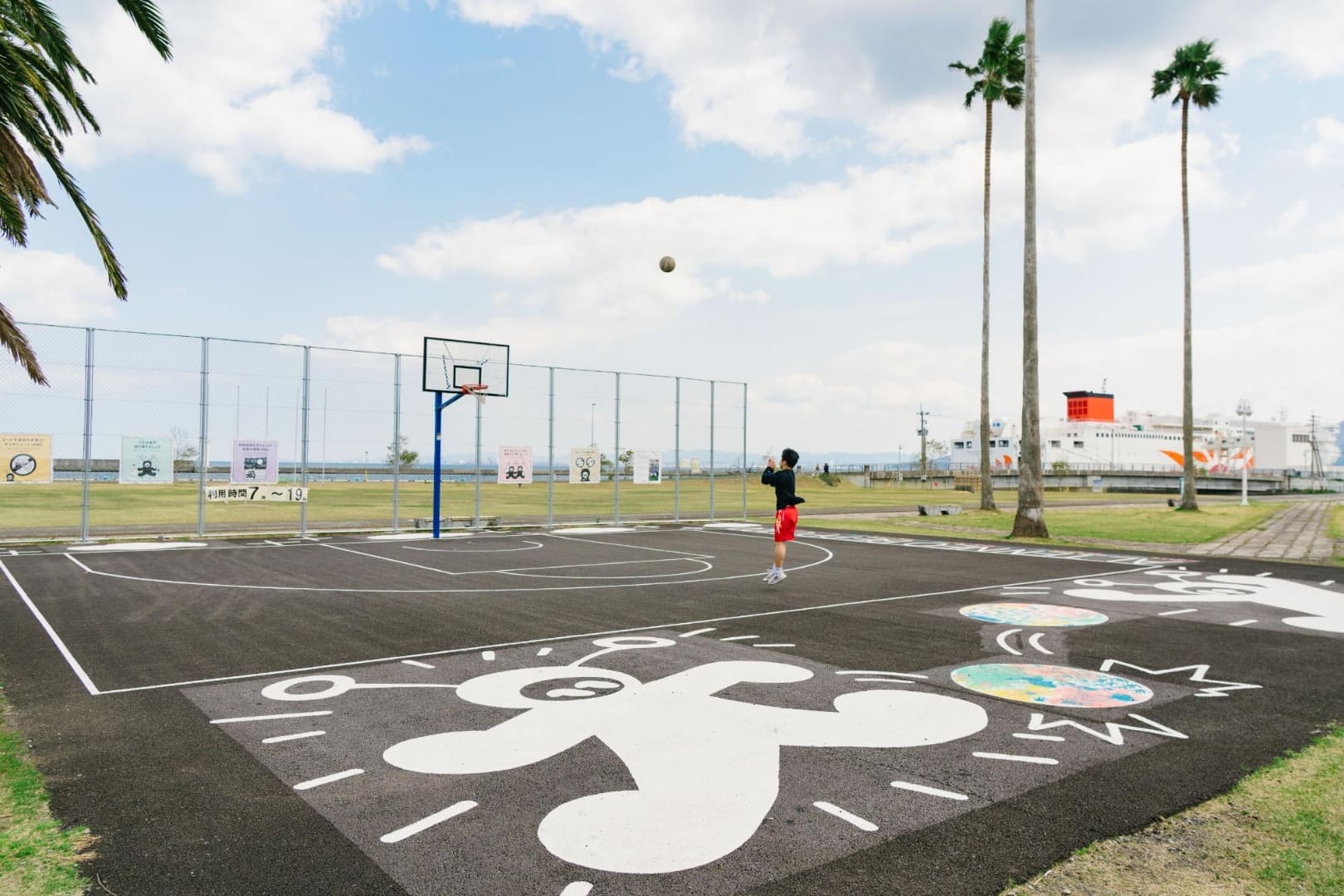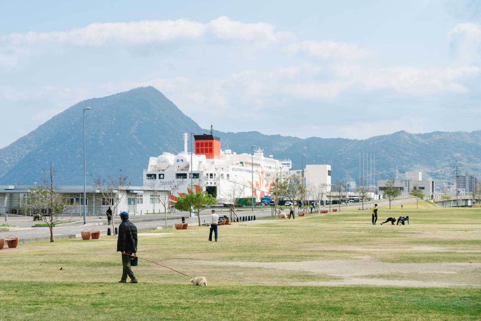 スケートボード広場やバスケットゴールがあり、アーバンスポーツを楽しめる海辺の公園。ワシントニアパーム、フェニックスなど南国感あふれる木が印象的です。商船三井さんふらわあが停泊する別府国際観光港のそばに位置し、大型客船が停泊した際には大迫力の船を間近でみられます。広くて開放的な芝生の広場があり、散歩やジョギングなど個人で利用する人や、グループでアクティブに楽しむ人たちなど、思い思いの時間を楽しんでいます。