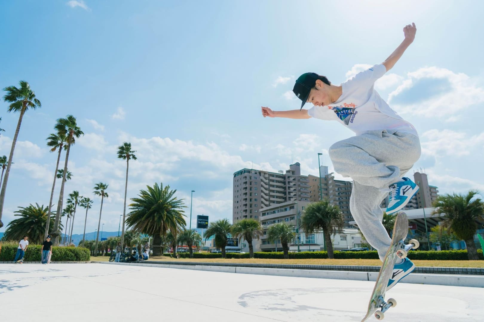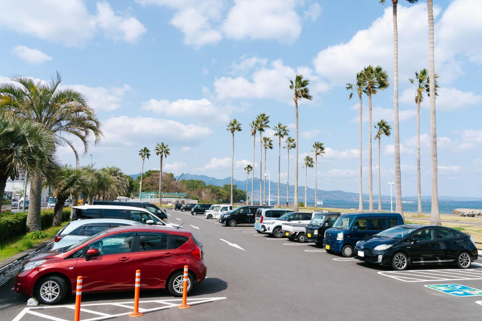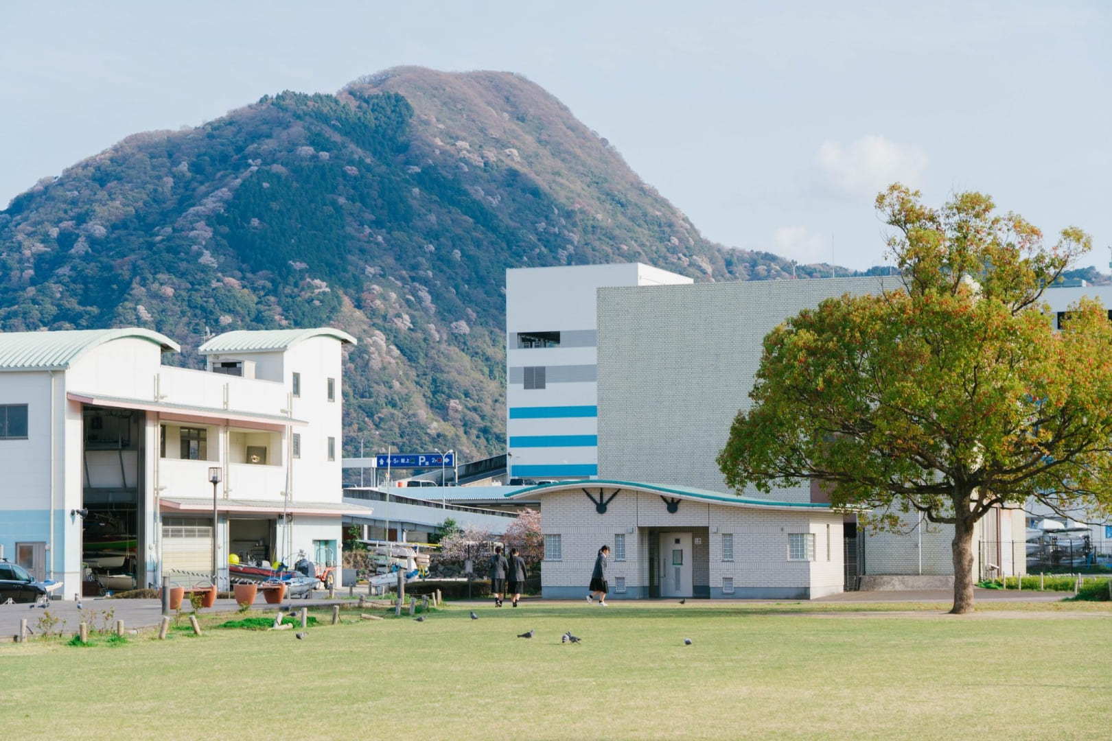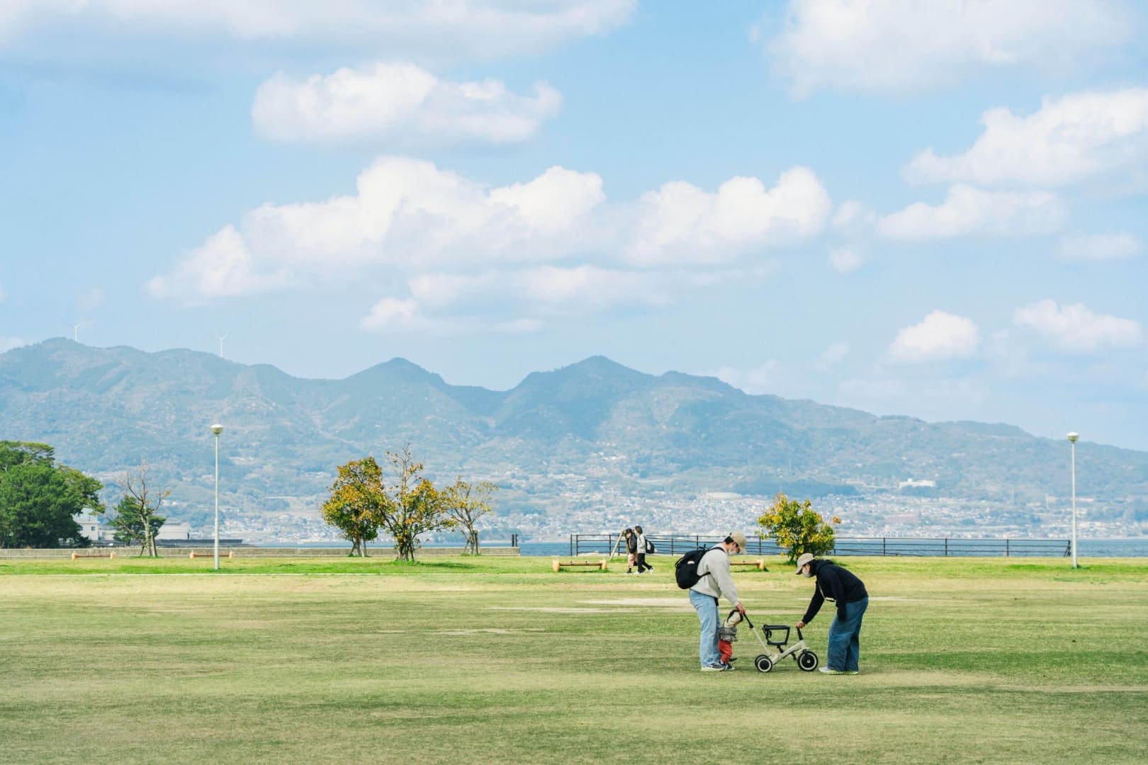 スケートボード広場やバスケットゴールがあり、アーバンスポーツを楽しめる海辺の公園。ワシントニアパーム、フェニックスなど南国感あふれる木が印象的です。商船三井さんふらわあが停泊する別府国際観光港のそばに位置し、大型客船が停泊した際には大迫力の船を間近でみられます。広くて開放的な芝生の広場があり、散歩やジョギングなど個人で利用する人や、グループでアクティブに楽しむ人たちなど、思い思いの時間を楽しんでいます。