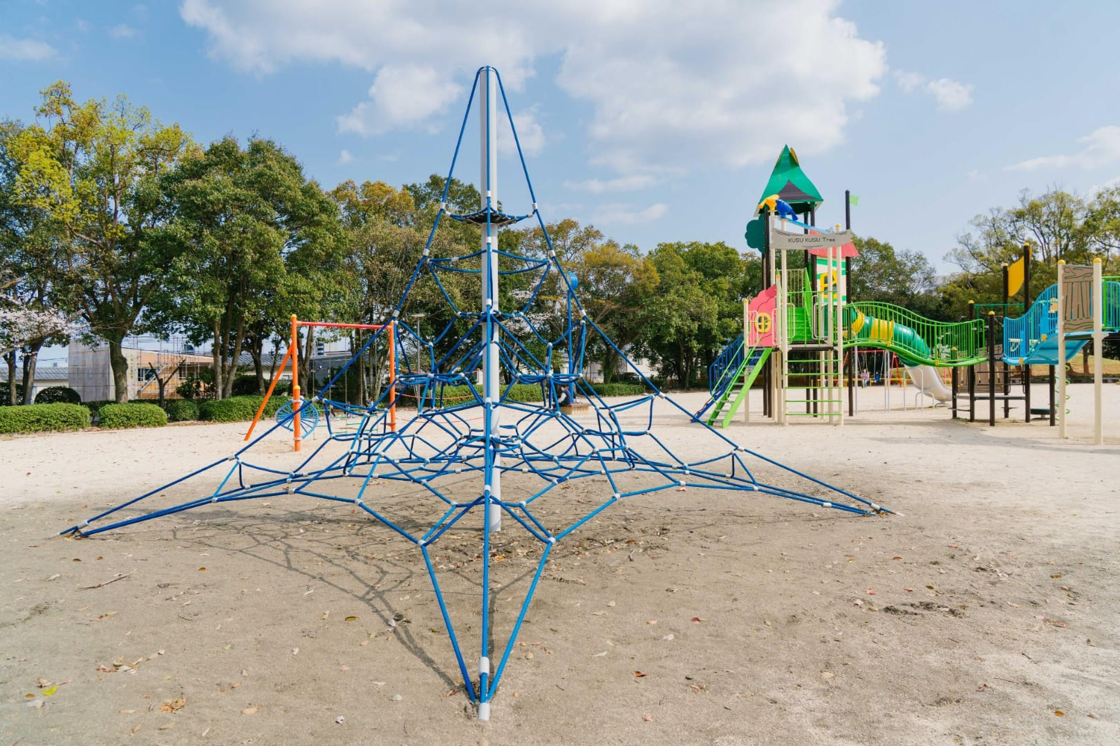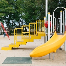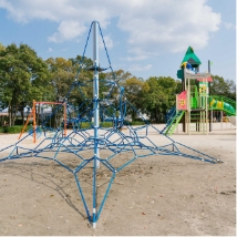 木々に囲まれた静かな公園です。障がいのある・なしにかかわらず楽しめるよう工夫されたインクルーシブ遊具が設置されています。ブランコ、すべり台、網をのぼる遊具など、見た目にもワクワクするようなデザイン。2025年に新設されたトイレは清潔でピカピカです。周囲は静かな住宅地で、別府を代表する名店もあるエリア。食後の腹ごなしに、もっとおいしく食べるための運動に、ぜひ訪れてみましょう。たっぷり遊んで汗をかいたら、アイスの自販機もありますよ。