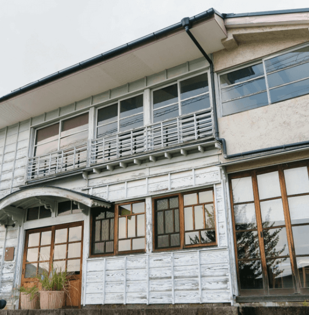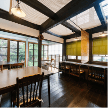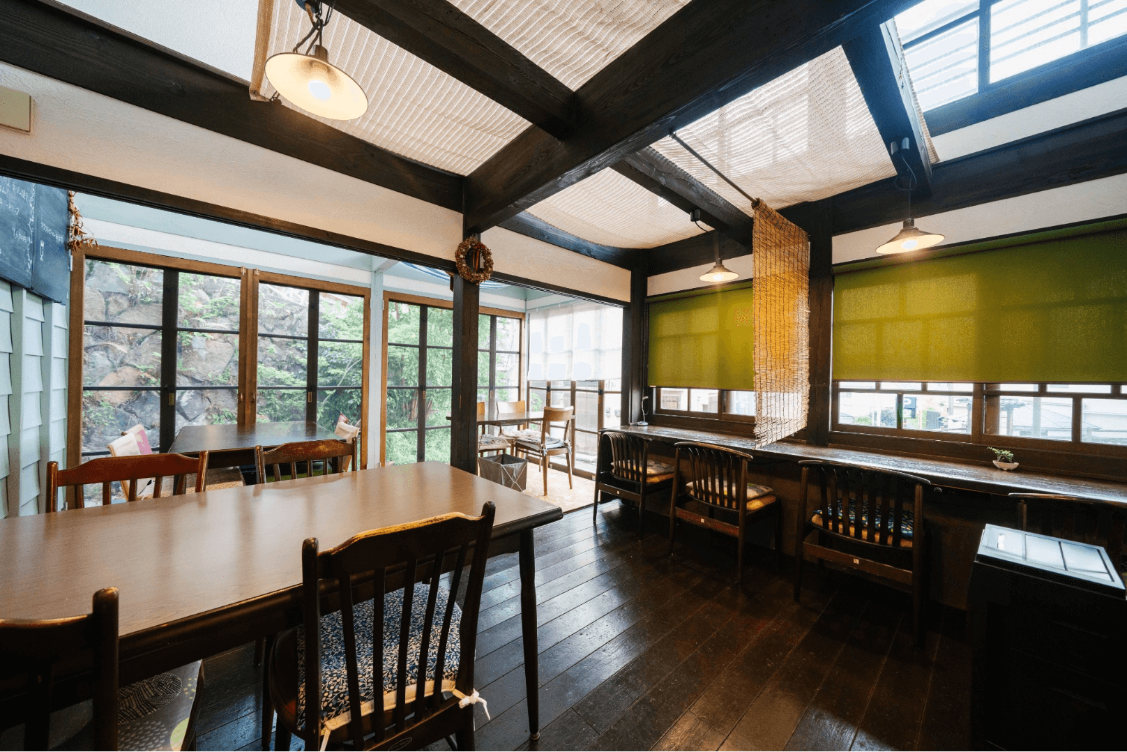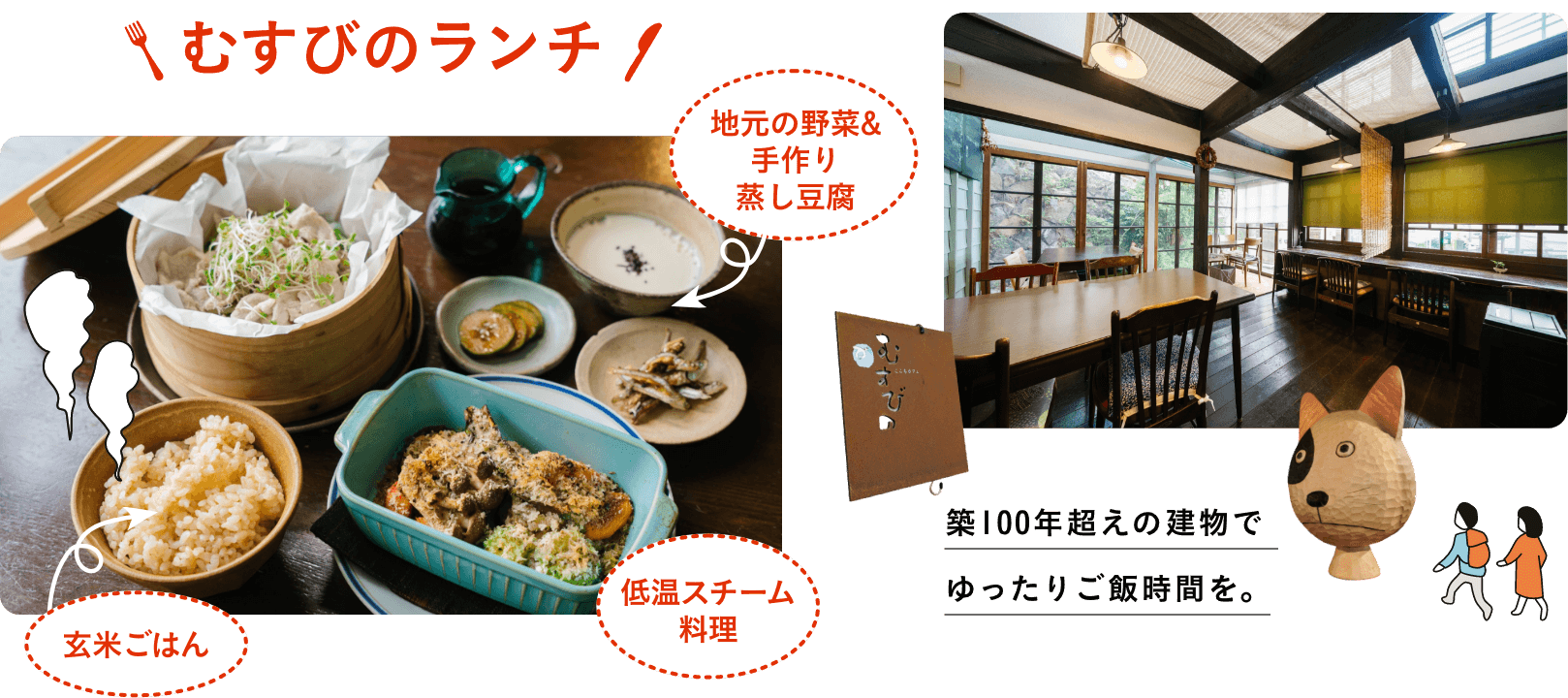 歴史ある温泉「熱の湯」のすぐそばに位置する、築100年超えの建物。以前は病院、現在はカフェとして利用されています。高い天井と窓ガラス、冬はこたつが用意され、ゆったり落ち着く空間が魅力的。ランチメニューは「本日のむすびのランチ」のみ。肉と魚でメイン2皿、小鉢と手作り蒸し豆腐、玄米ごはんのセットです。近所の直売場などで調達した地元の野菜をたっぷり使用。低温スチーム料理が1品入っていることが多く、ヘルシーでからだに優しい食事を楽しめます。手作りの蒸し豆腐は絶品で、食べたことのないなめらかさと食感を堪能できますよ。ドリンクはドリンクバーでコーヒーやビネガードリンクなど、日替わり。お店では不定期で音楽イベントなども開催中です。