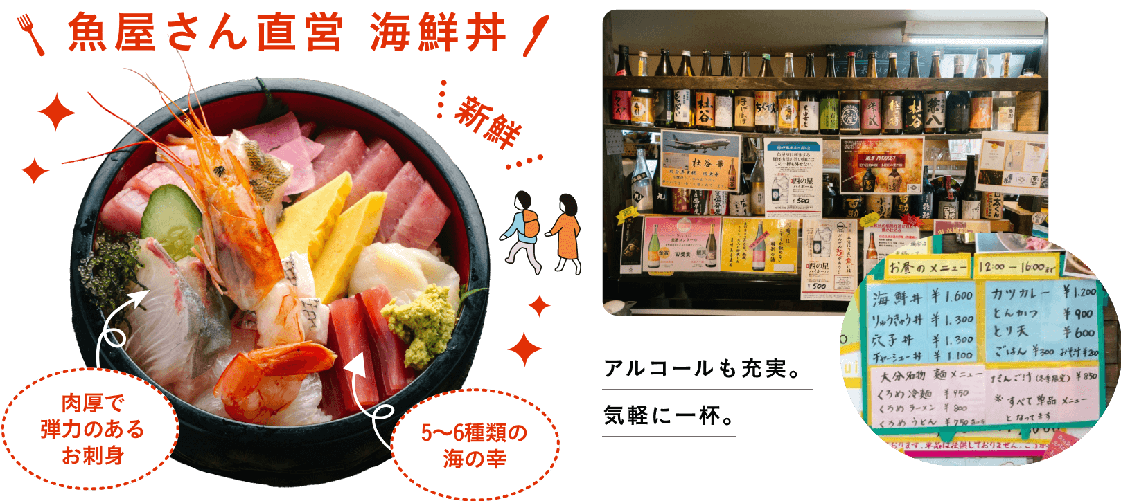 ランチで新鮮な魚介を味わいたいなら、このお店。魚屋さん直営のため、鮮度と品質は折り紙付き。肉厚で弾力のあるお刺身が気前よく盛り付けられている、大満足の丼が名物です。海鮮丼には5〜6種類の海の幸。甘味のあるタレとごま・ネギの風味がくせになる郷土料理「りゅうきゅう」の丼も大人気です。鉄輪では珍しい生しらす丼や、大分県の特産品である粘りの強い海藻・くろめの冷麺、ラーメン、うどんも好評。鶏むね肉使用、サクふわ食感がクセになる「とり天」をシェアする人も多いそう。海外のお客さまには、カツカレーが人気です。焼酎、日本酒、ビールなどアルコールも充実。お昼から気軽に一杯楽しむのも、観光の醍醐味ですね。※予約不可