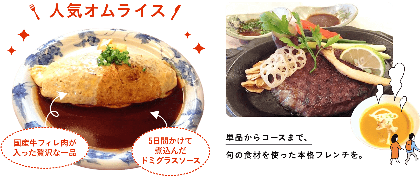 鉄輪観光案内所から徒歩数十秒に位置する、行列のできる大人気フレンチレストラン。気取らず入れるアットホームな雰囲気が魅力です。お店の一番人気は三ツ星オリジナルオムライス。大分県産のお米、野菜、きのこ、国産牛を特製デミグラスソースで味付けしたぜいたくな逸品です。おすすめの和牛ハンバーグ、お魚ランチ、ビーフシチュー、そしてフィレステーキランチは、鉄輪温泉の蒸し野菜を添えています。ソースは、それぞれシェフオリジナルソースでお召し上がりください。夏は冷製、冬はあたたかい「季節のスープ」もお見逃しなく。他にもオリジナルスパイスの三ツ星カレーや、シェフ自慢のハヤシライス、和牛のビーフシチューにお魚ランチ、牛フィレステーキランチなど、心くすぐるメニューがずらり。単品からコースまで、旬の食材を使った本格フレンチをお楽しみいただけます。