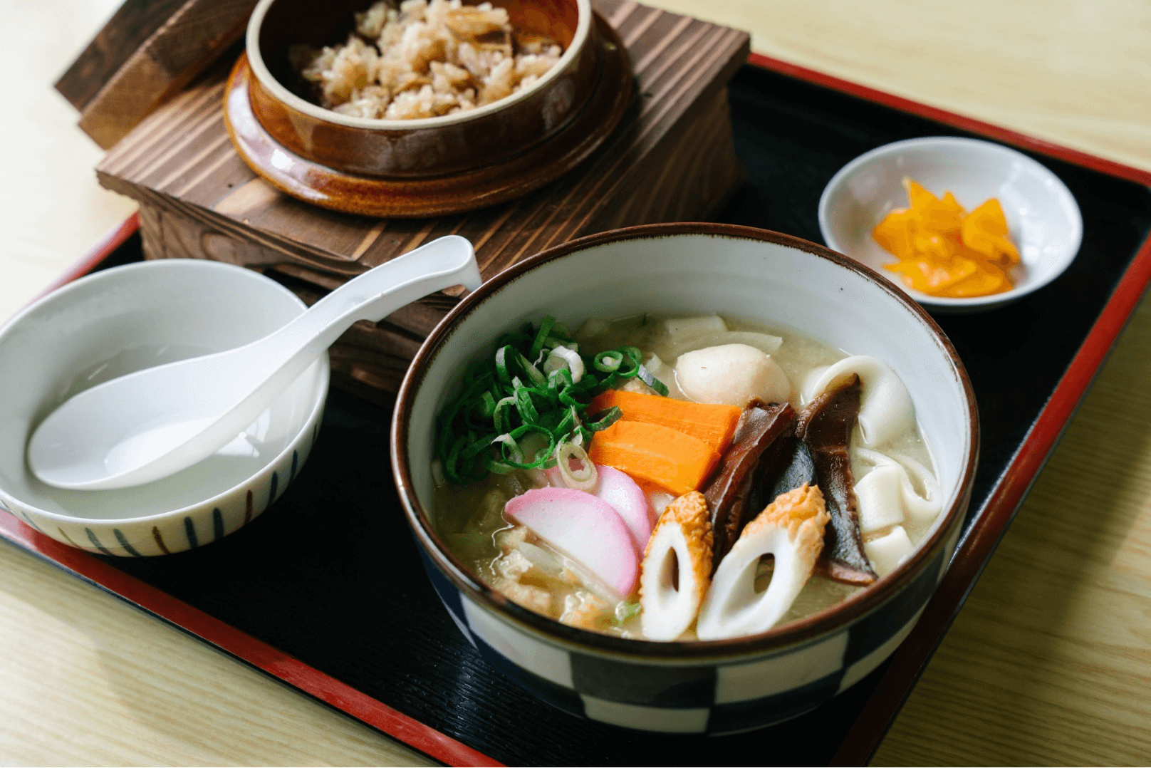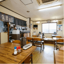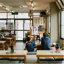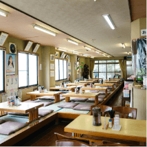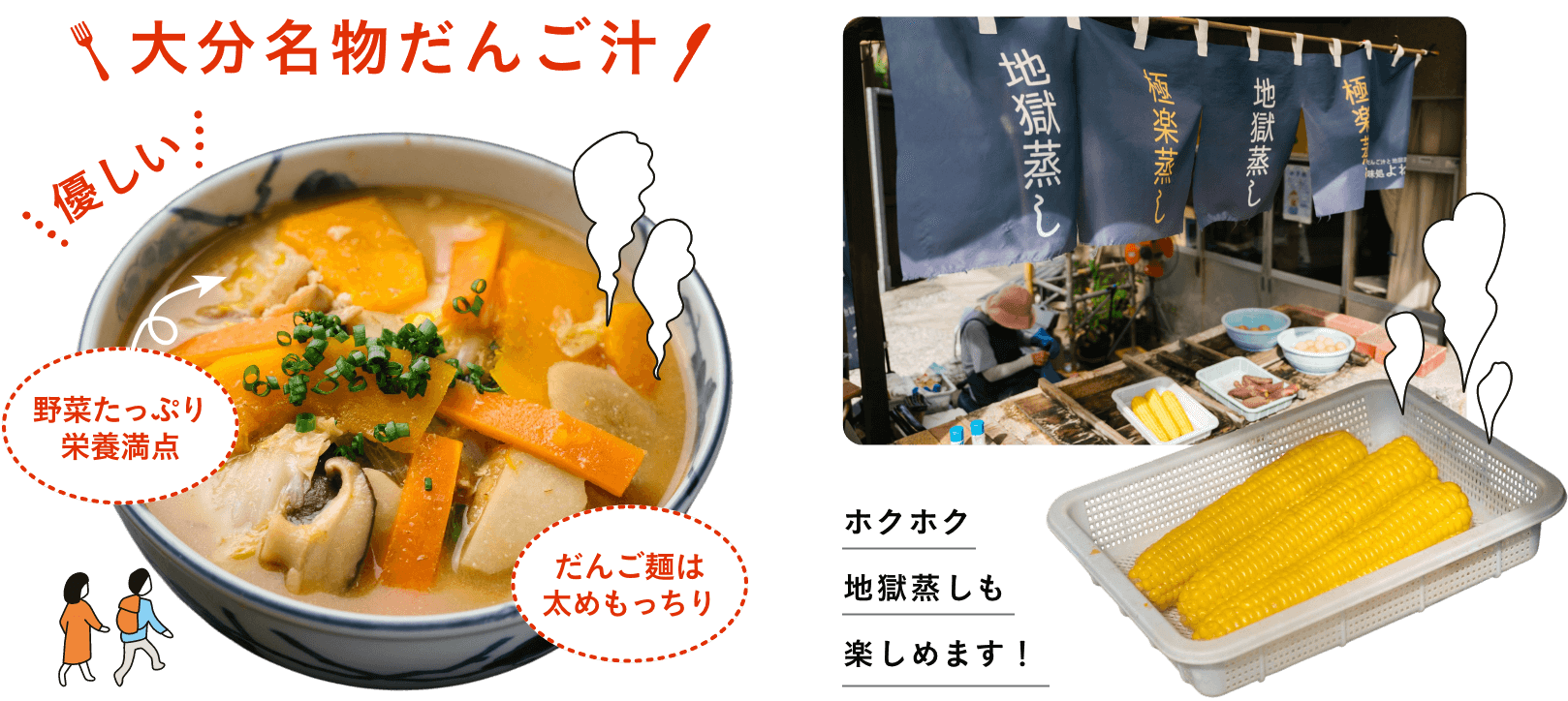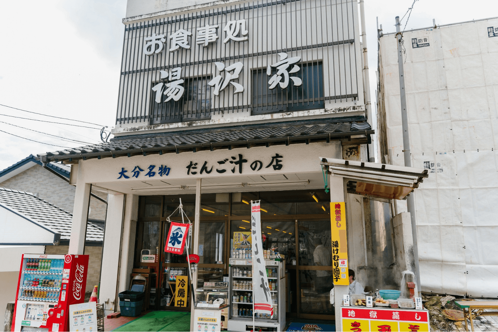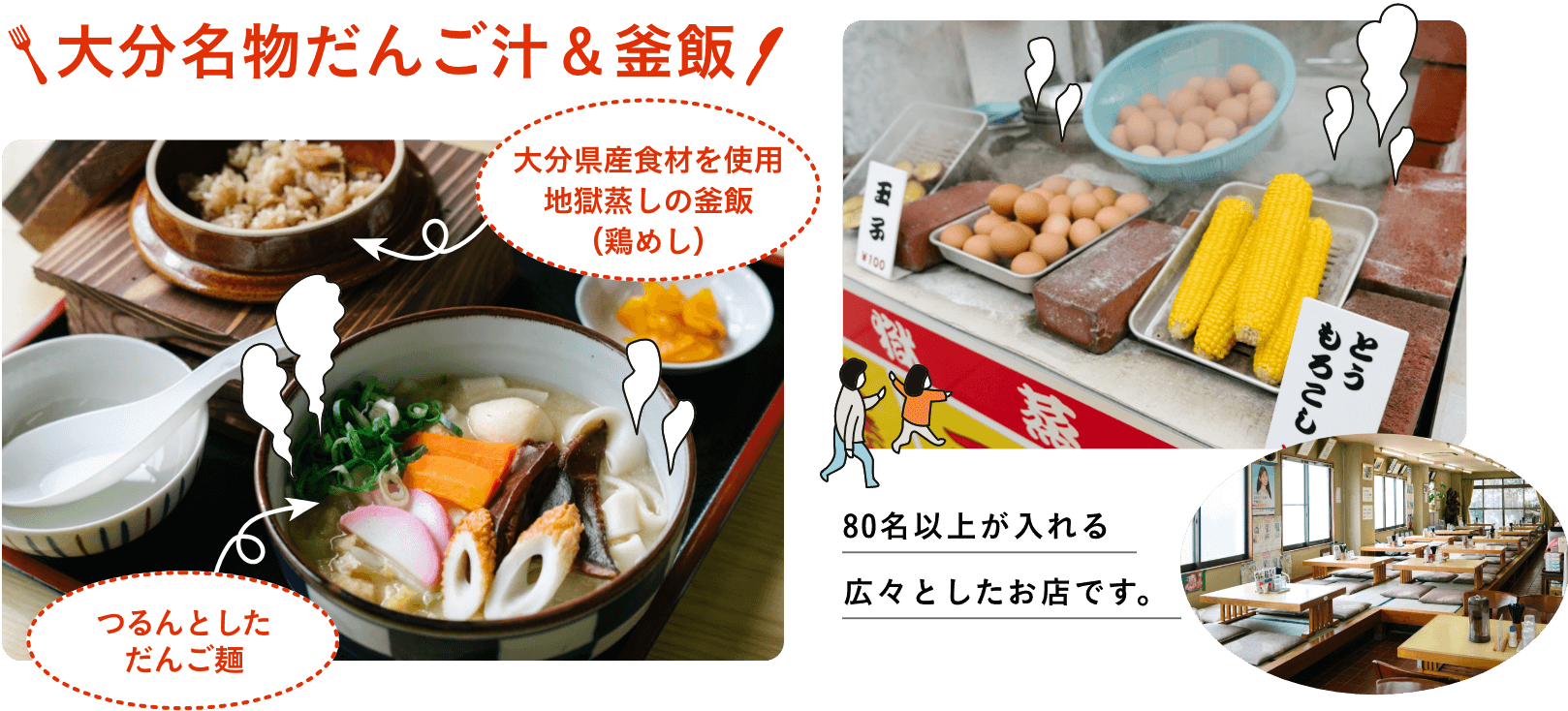 創業1949(昭和24)年、昔ながらの面影をそのままに残す大衆食堂です。小上がりの座敷席とテーブル席があり、80名以上が入れる広々としたお店。看板メニュー・大分名物だんご汁には、白菜、ちくわ、かまぼこ、ネギ、にんじん、さといもと、大分県産の野菜がたっぷり。肉厚のしいたけは甘辛く煮付けてあり、味がじんわりしみています。合わせ味噌と、つるんとしただんご麺でさっぱりヘルシー。定食には、大分県産の鶏とごぼう、米を使用した地獄蒸しの釜飯(鶏めし)がついています。サイドメニューにはたまご、さつまいも、とうもろこしの地獄蒸しをどうぞ。注文を受けてから地獄蒸しする「湯けむり団子」は、きな粉砂糖がまぶされた、食後にぴったりの一品です。