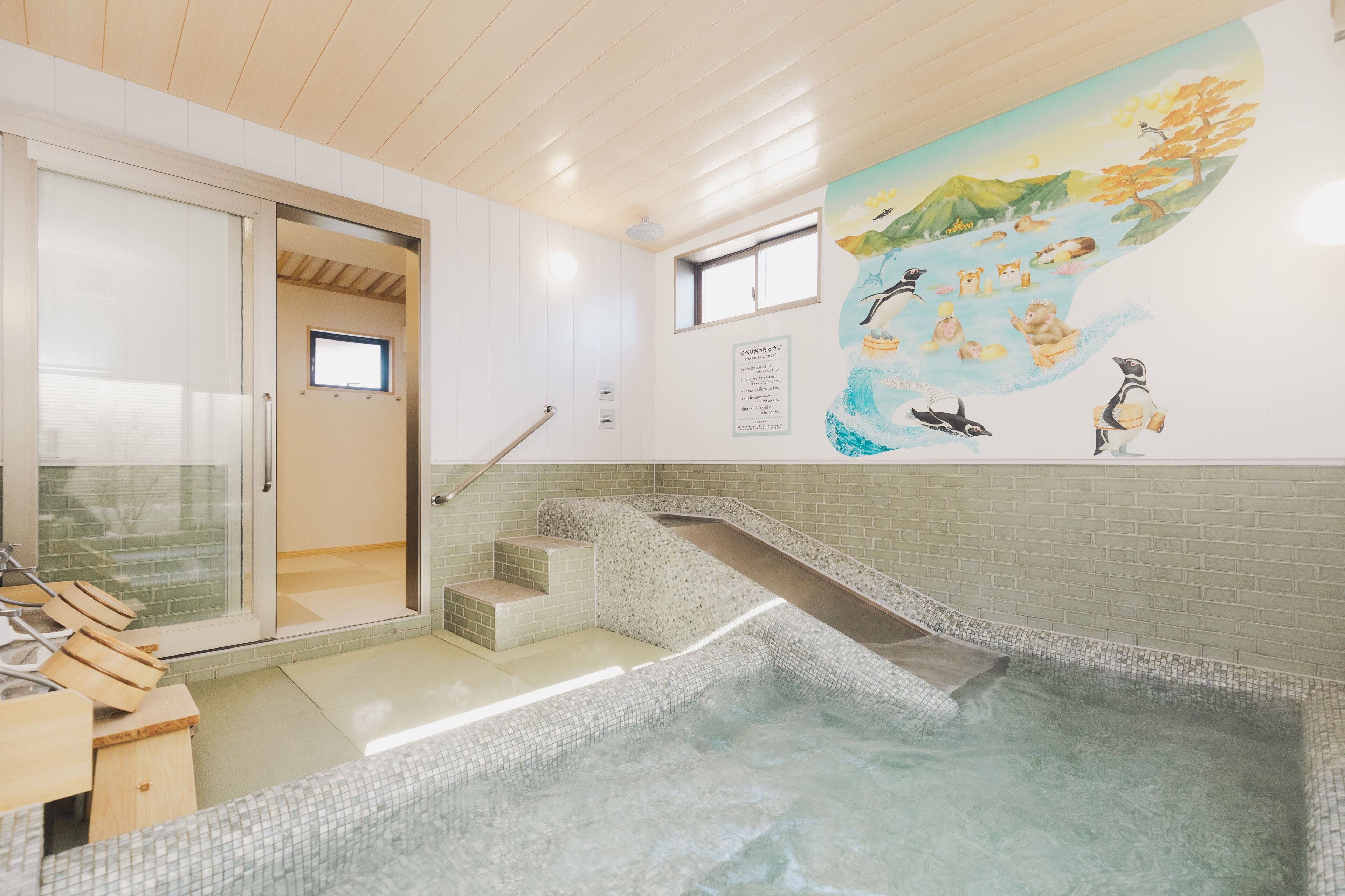 泉質は、肌あたりがやさしい炭酸水素塩泉。刺激が少ないため、肌が弱い方にも安心してご利用いただけます。さらに、天然保湿成分のメタケイ酸も豊富に含んでおり、お肌のツルツルも期待できます。館内には、選ぶのが楽しいシャンプーバイキングや、お子さまに人気のおもちゃも充実。個室でゆっくり過ごせるため、乳幼児のお子さま連れでも気兼ねなくお楽しみいただけます。