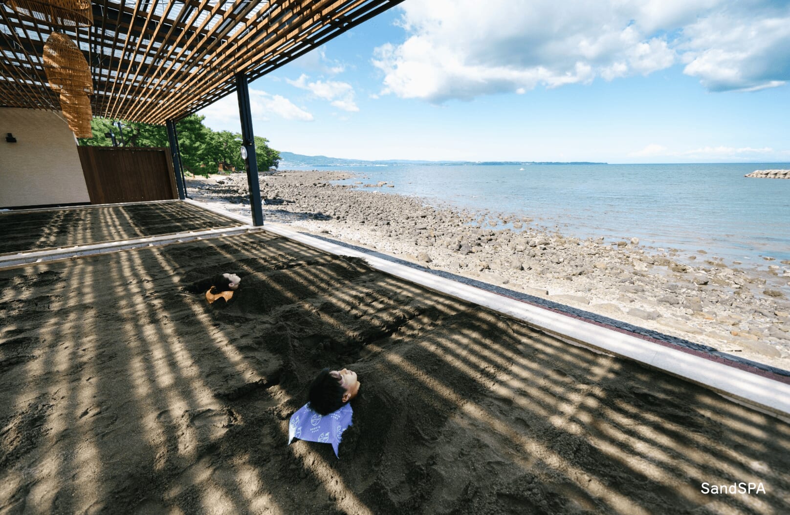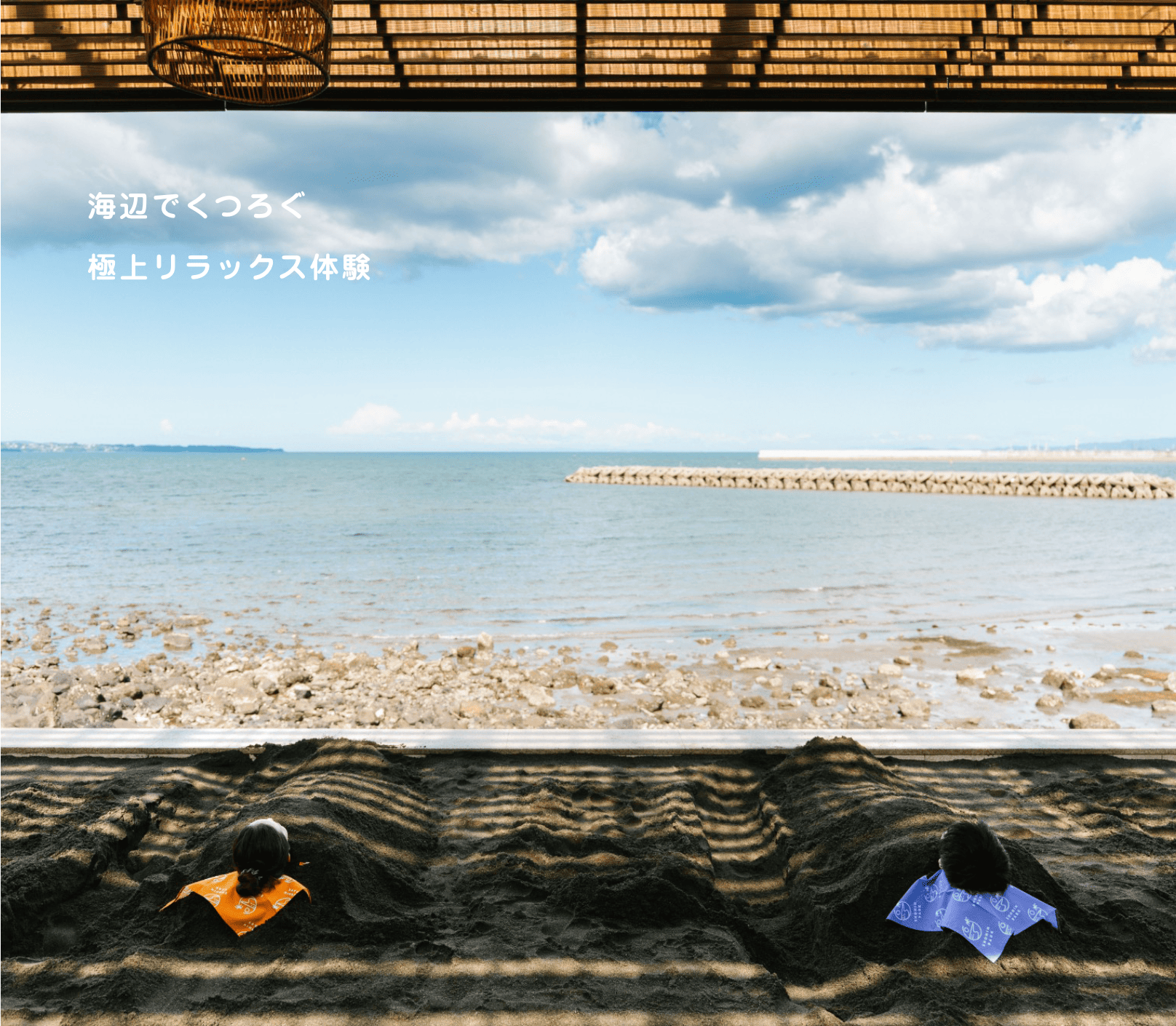 連日多くの観光客が訪れる砂湯には、温泉をたっぷりと張って加熱した砂を使用。そこに横になると、砂かけさんが“ジョレン”と呼ばれる専用の道具を使って体に砂をかけてくれます。水分を含んだ砂のほどよい重さが全身を包み、なんともいえない心地よさにうっとりしていると、ほどなく体がじんわりと温まってきます。静かに目を閉じれば、打ち寄せる波の音や、頬をなぞる潮風が、リゾート気分をさらに高めてくれます。そして、砂から出たあとの海風が最高に気持ちいい!-豊かな自然の恵みに感謝したくなる、この場所だからこそ感じられる感覚です。砂に埋もれたちょっとユニークな姿は、砂かけさんにお願いすれば記念撮影してもらえるので、ぜひ体験してみてください。