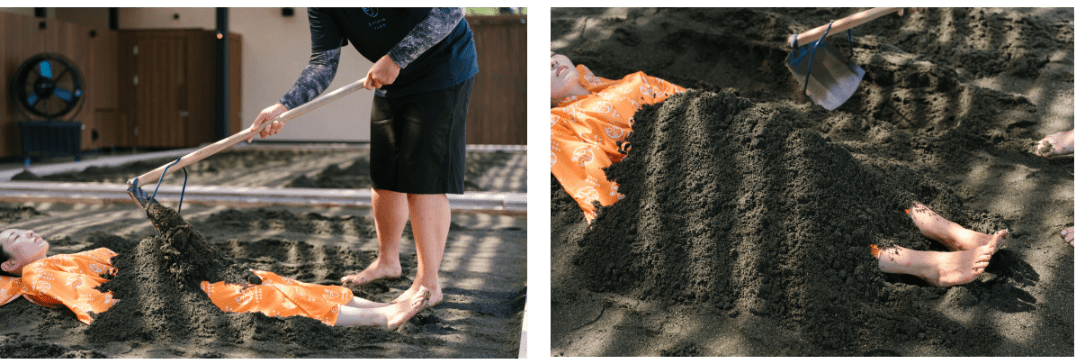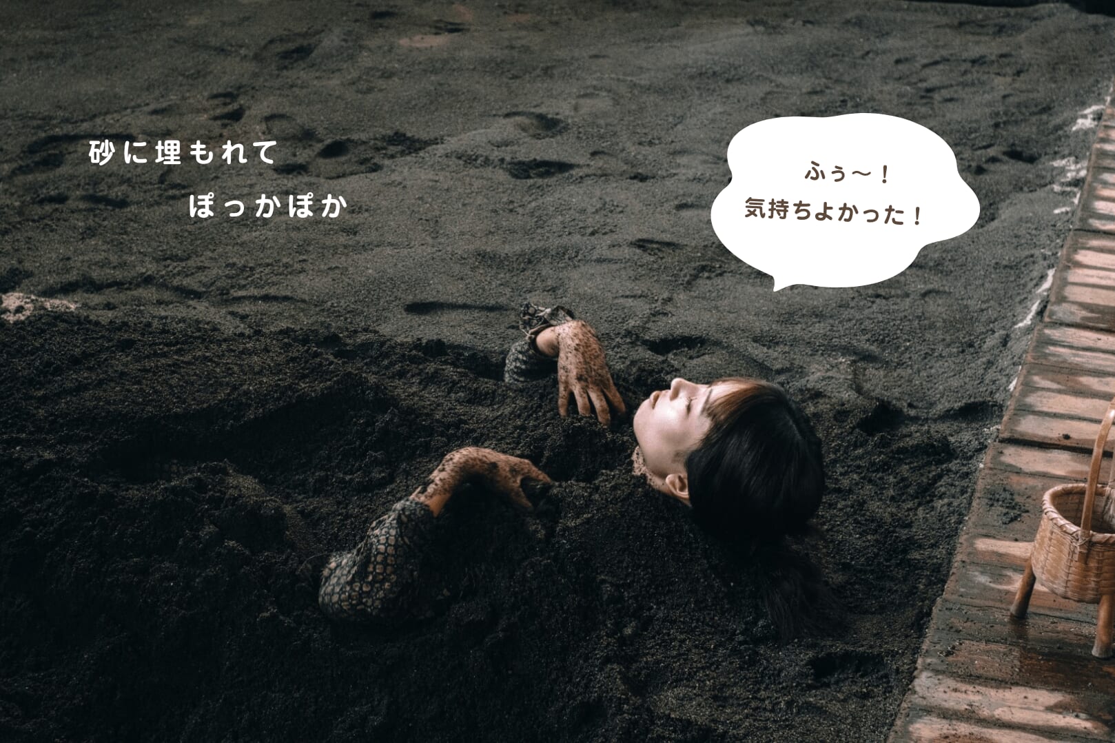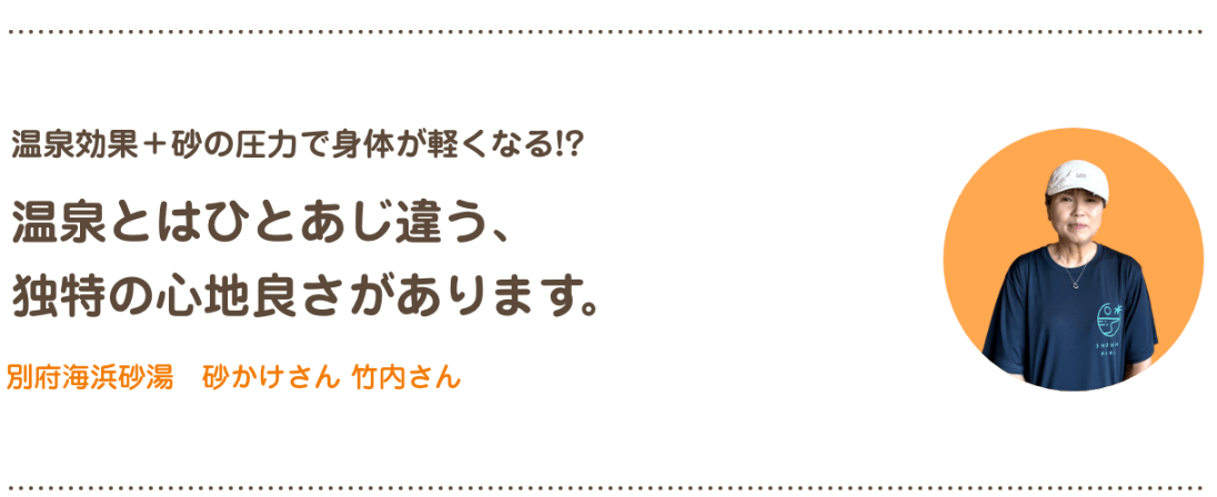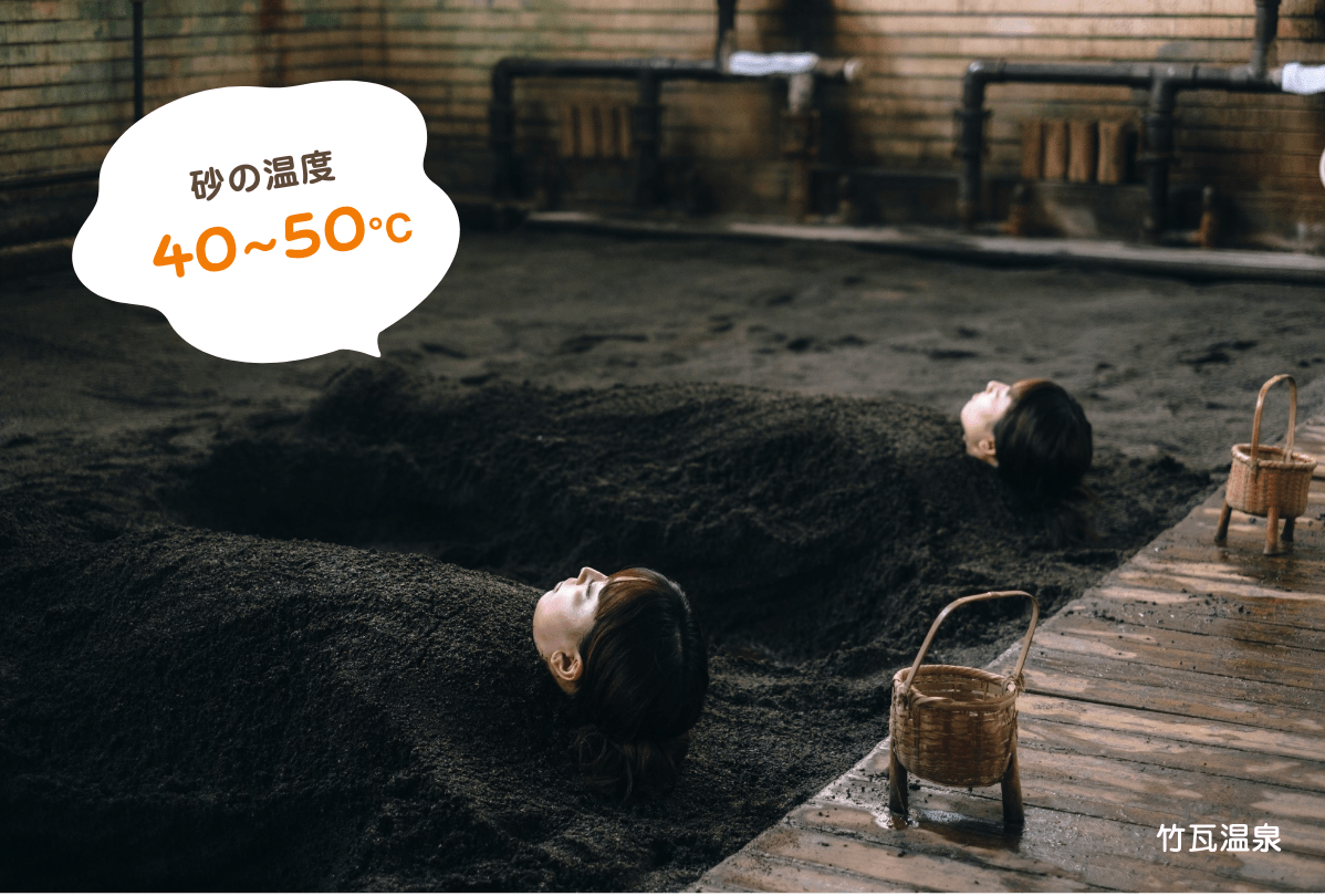 竹内さんが教えてくれた砂湯の大きな特徴は、全身に感じられる指圧効果です。「砂の重さによって全身のツボが刺激されているような感覚になります。肩や腰など不調のある部位に多めにかけてほしいとお願いされることも。砂から出ると、“身体が軽くなった!”と驚くお客さまが多いです」。温泉とはちょっと違う、砂湯ならではの心地よさがあるようです。
