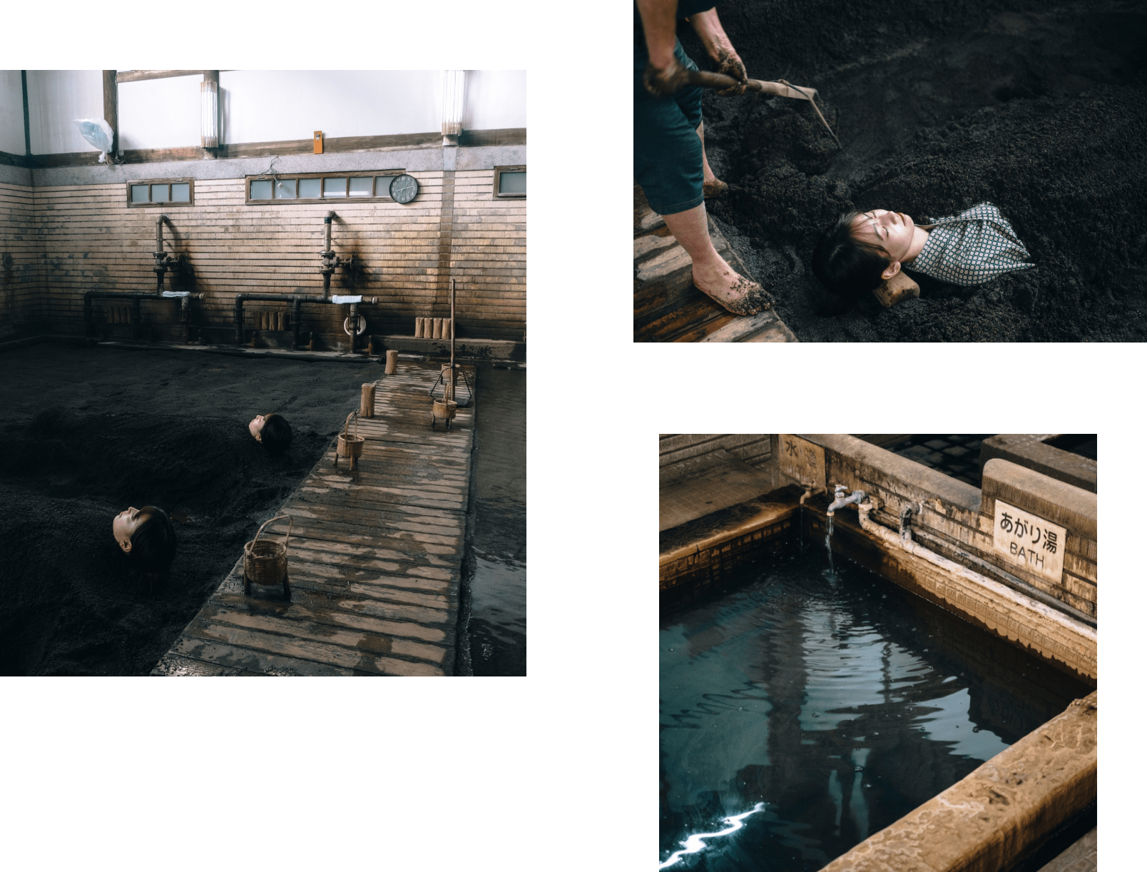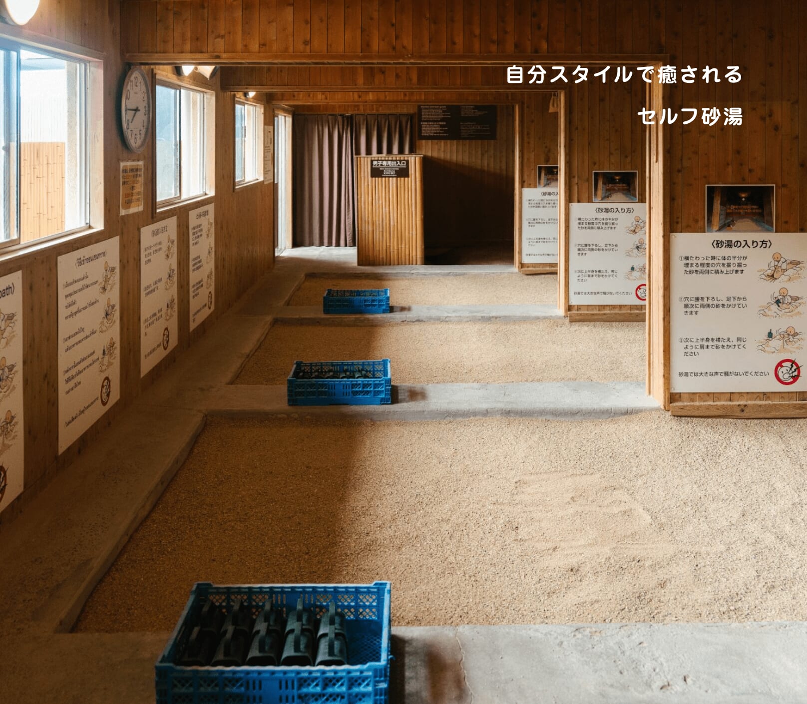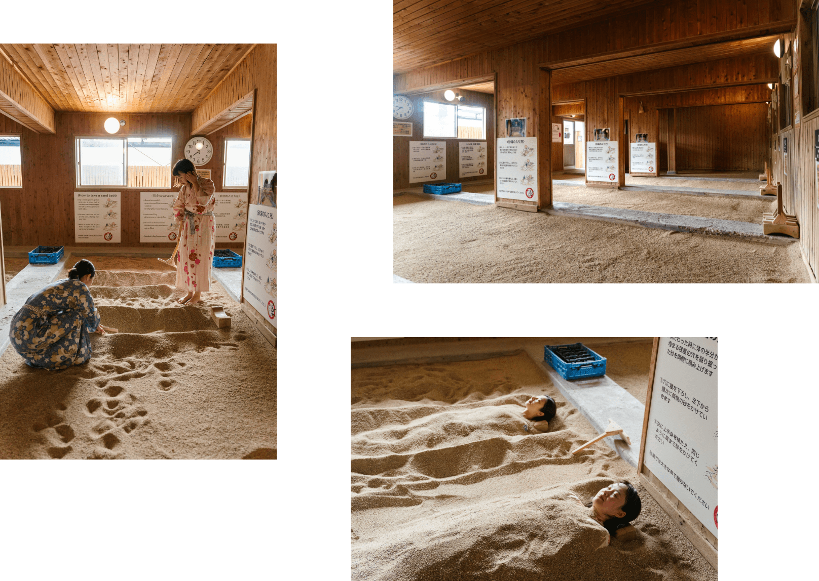 竹内さんが教えてくれた砂湯の大きな特徴は、全身に感じられる指圧効果です。「砂の重さによって全身のツボが刺激されているような感覚になります。肩や腰など不調のある部位に多めにかけてほしいとお願いされることも。砂から出ると、“身体が軽くなった!”と驚くお客さまが多いです」。温泉とはちょっと違う、砂湯ならではの心地よさがあるようです。