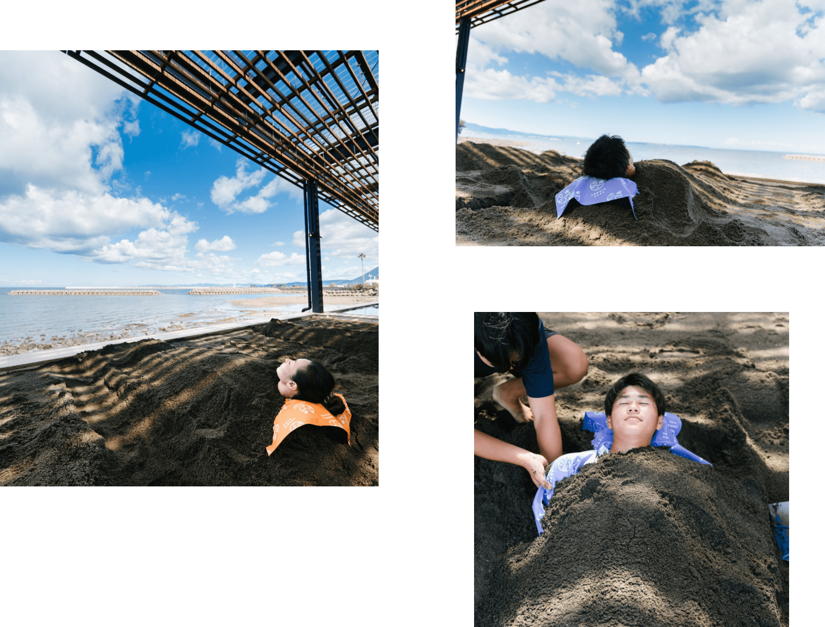 「温度の加減を聞きながら、砂の量やかける箇所を調整します」と、とても繊細な作業が必要ですが、全身が砂に埋まった状態でゆっくりと過ごしてもらうために、砂かけの時間はわずか3分程度。そんな忙しい砂かけ中にもコミュニケーションを欠かしません。「どこから来られたのかを伺ったり、おすすめのスポットをお伝えしたり。いろんな地域から来てくださるので、私たちも会話が楽しいんです」といいます。