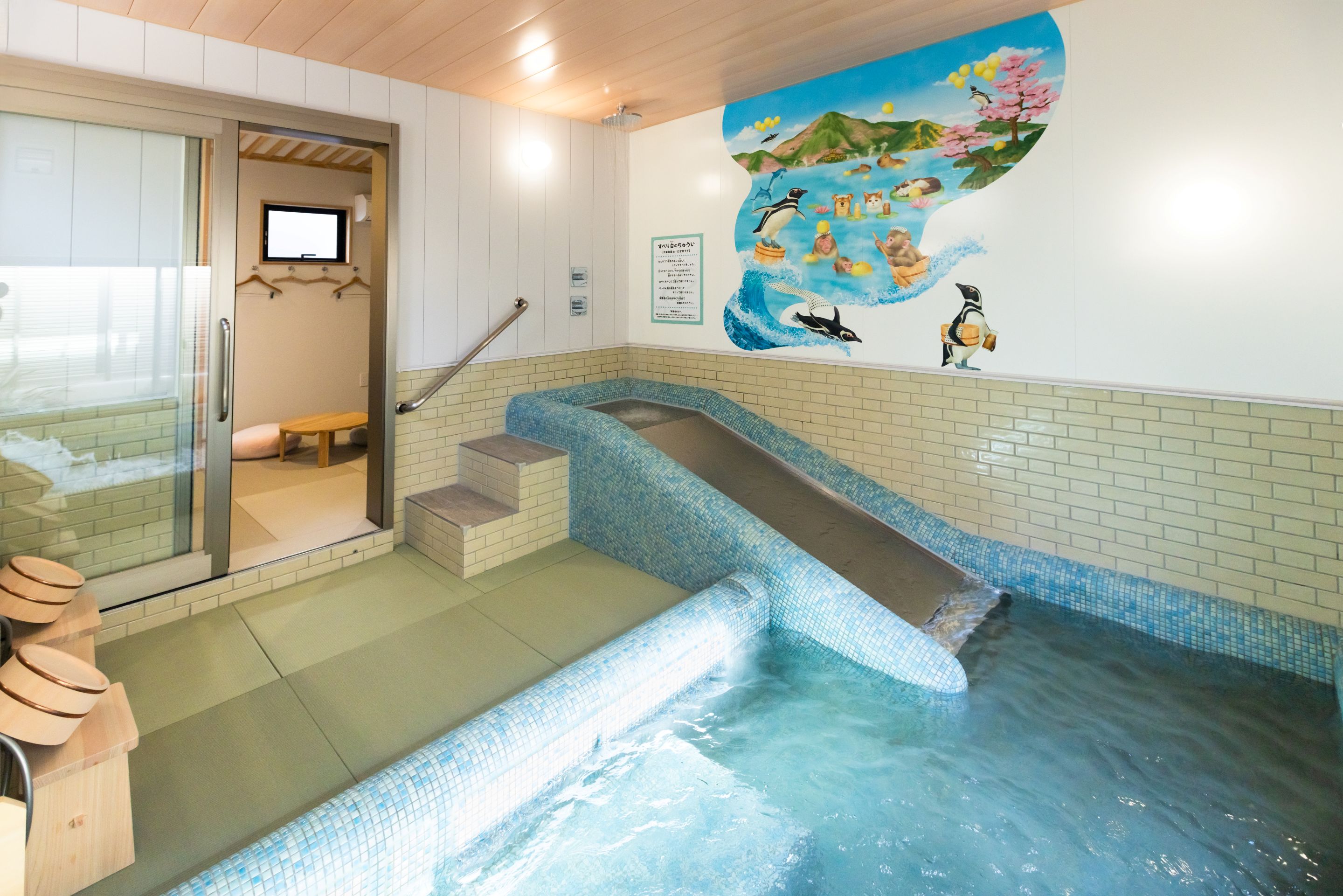 市営温泉では初めての試みとなるオストメイト対応トイレも設置しており、高齢者や身障者の方が利用しやすい よう配慮した設計になっており、浴槽や脱衣場も手すりを設置する等工夫がされています。